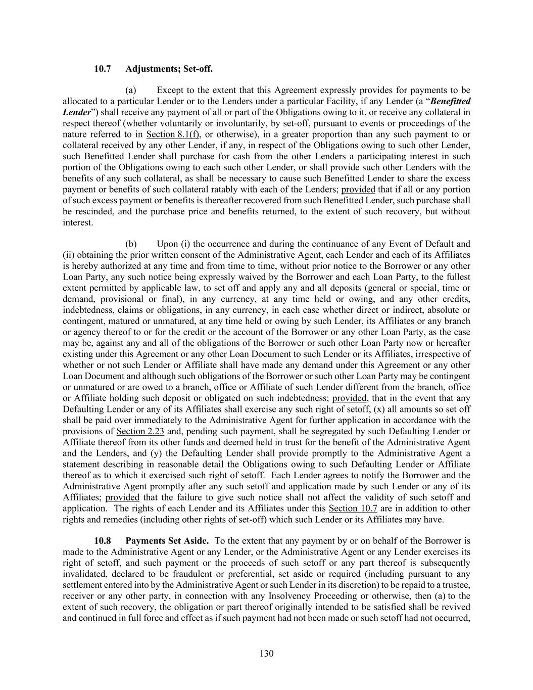 130 Adjustments; Set-off. (a) Except to the extent that this Agreement expressly provides for payments to be allocated to a particular Lender or to the Lenders under a particular Facility, if any Lender (a “Benefitted Lender”) shall receive any payment of all or part of the Obligations owing to it, or receive any collateral in respect thereof (whether voluntarily or involuntarily, by set-off, pursuant to events or proceedings of the nature referred to in Section 8.1(f), or otherwise), in a greater proportion than any such payment to or collateral received by any other Lender, if any, in respect of the Obligations owing to such other Lender, such Benefitted Lender shall purchase for cash from the other Lenders a participating interest in such portion of the Obligations owing to each such other Lender, or shall provide such other Lenders with the benefits of any such collateral, as shall be necessary to cause such Benefitted Lender to share the excess payment or benefits of such collateral ratably with each of the Lenders; provided that if all or any portion of such excess payment or benefits is thereafter recovered from such Benefitted Lender, such purchase shall be rescinded, and the purchase price and benefits returned, to the extent of such recovery, but without interest. (b) Upon (i) the occurrence and during the continuance of any Event of Default and (ii) obtaining the prior written consent of the Administrative Agent, each Lender and each of its Affiliates is hereby authorized at any time and from time to time, without prior notice to the Borrower or any other Loan Party, any such notice being expressly waived by the Borrower and each Loan Party, to the fullest extent permitted by applicable law, to set off and apply any and all deposits (general or special, time or demand, provisional or final), in any currency, at any time held or owing, and any other credits, indebtedness, claims or obligations, in any currency, in each case whether direct or indirect, absolute or contingent, matured or unmatured, at any time held or owing by such Lender, its Affiliates or any branch or agency thereof to or for the credit or the account of the Borrower or any other Loan Party, as the case may be, against any and all of the obligations of the Borrower or such other Loan Party now or hereafter existing under this Agreement or any other Loan Document to such Lender or its Affiliates, irrespective of whether or not such Lender or Affiliate shall have made any demand under this Agreement or any other Loan Document and although such obligations of the Borrower or such other Loan Party may be contingent or unmatured or are owed to a branch, office or Affiliate of such Lender different from the branch, office or Affiliate holding such deposit or obligated on such indebtedness; provided, that in the event that any Defaulting Lender or any of its Affiliates shall exercise any such right of setoff, (x) all amounts so set off shall be paid over immediately to the Administrative Agent for further application in accordance with the provisions of Section 2.23 and, pending such payment, shall be segregated by such Defaulting Lender or Affiliate thereof from its other funds and deemed held in trust for the benefit of the Administrative Agent and the Lenders, and (y) the Defaulting Lender shall provide promptly to the Administrative Agent a statement describing in reasonable detail the Obligations owing to such Defaulting Lender or Affiliate thereof as to which it exercised such right of setoff. Each Lender agrees to notify the Borrower and the Administrative Agent promptly after any such setoff and application made by such Lender or any of its Affiliates; provided that the failure to give such notice shall not affect the validity of such setoff and application. The rights of each Lender and its Affiliates under this Section 10.7 are in addition to other rights and remedies (including other rights of set-off) which such Lender or its Affiliates may have. Payments Set Aside. To the extent that any payment by or on behalf of the Borrower is made to the Administrative Agent or any Lender, or the Administrative Agent or any Lender exercises its right of setoff, and such payment or the proceeds of such setoff or any part thereof is subsequently invalidated, declared to be fraudulent or preferential, set aside or required (including pursuant to any settlement entered into by the Administrative Agent or such Lender in its discretion) to be repaid to a trustee, receiver or any other party, in connection with any Insolvency Proceeding or otherwise, then (a) to the extent of such recovery, the obligation or part thereof originally intended to be satisfied shall be revived and continued in full force and effect as if such payment had not been made or such setoff had not occurred,