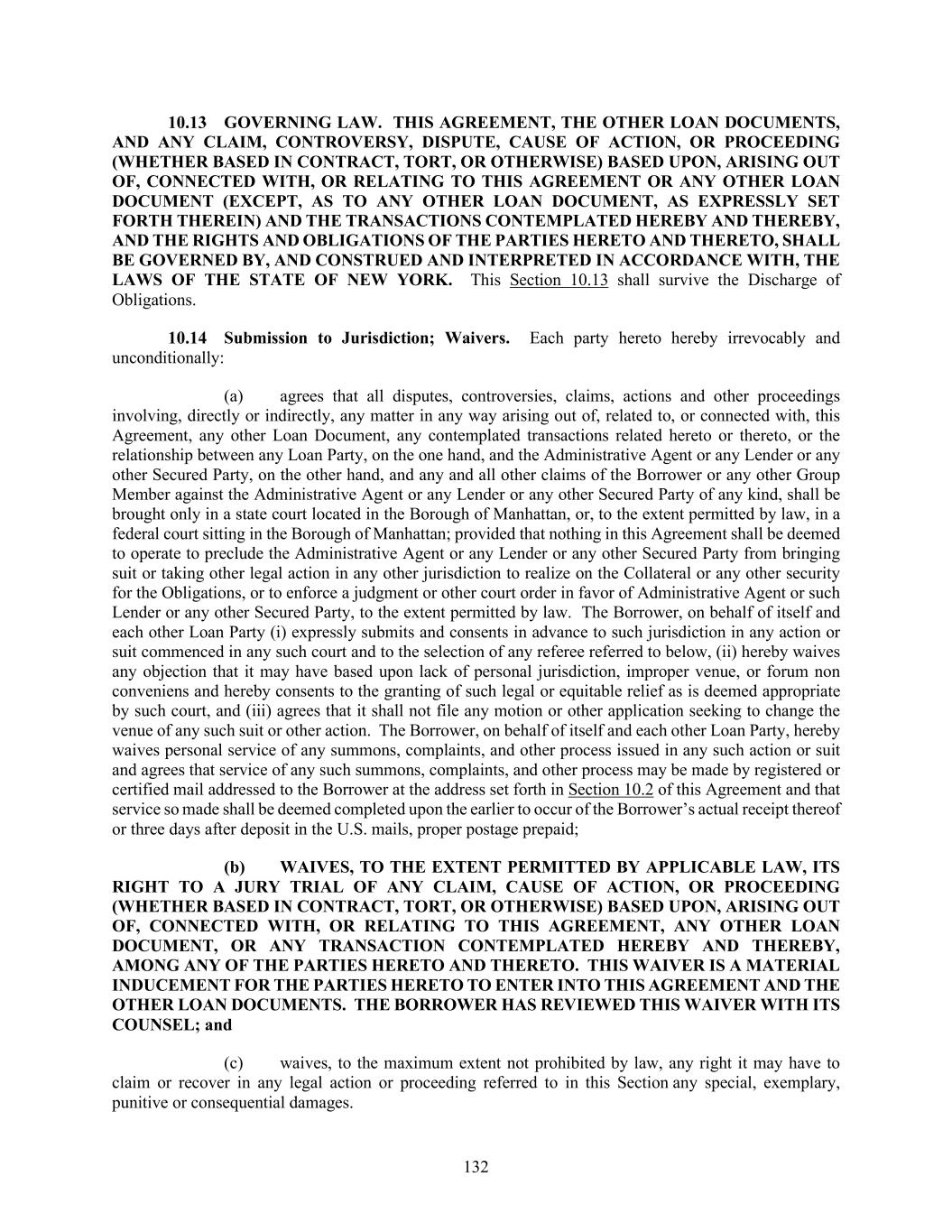 132 GOVERNING LAW. THIS AGREEMENT, THE OTHER LOAN DOCUMENTS, AND ANY CLAIM, CONTROVERSY, DISPUTE, CAUSE OF ACTION, OR PROCEEDING (WHETHER BASED IN CONTRACT, TORT, OR OTHERWISE) BASED UPON, ARISING OUT OF, CONNECTED WITH, OR RELATING TO THIS AGREEMENT OR ANY OTHER LOAN DOCUMENT (EXCEPT, AS TO ANY OTHER LOAN DOCUMENT, AS EXPRESSLY SET FORTH THEREIN) AND THE TRANSACTIONS CONTEMPLATED HEREBY AND THEREBY, AND THE RIGHTS AND OBLIGATIONS OF THE PARTIES HERETO AND THERETO, SHALL BE GOVERNED BY, AND CONSTRUED AND INTERPRETED IN ACCORDANCE WITH, THE LAWS OF THE STATE OF NEW YORK. This Section 10.13 shall survive the Discharge of Obligations. Submission to Jurisdiction; Waivers. Each party hereto hereby irrevocably and unconditionally: (a) agrees that all disputes, controversies, claims, actions and other proceedings involving, directly or indirectly, any matter in any way arising out of, related to, or connected with, this Agreement, any other Loan Document, any contemplated transactions related hereto or thereto, or the relationship between any Loan Party, on the one hand, and the Administrative Agent or any Lender or any other Secured Party, on the other hand, and any and all other claims of the Borrower or any other Group Member against the Administrative Agent or any Lender or any other Secured Party of any kind, shall be brought only in a state court located in the Borough of Manhattan, or, to the extent permitted by law, in a federal court sitting in the Borough of Manhattan; provided that nothing in this Agreement shall be deemed to operate to preclude the Administrative Agent or any Lender or any other Secured Party from bringing suit or taking other legal action in any other jurisdiction to realize on the Collateral or any other security for the Obligations, or to enforce a judgment or other court order in favor of Administrative Agent or such Lender or any other Secured Party, to the extent permitted by law. The Borrower, on behalf of itself and each other Loan Party (i) expressly submits and consents in advance to such jurisdiction in any action or suit commenced in any such court and to the selection of any referee referred to below, (ii) hereby waives any objection that it may have based upon lack of personal jurisdiction, improper venue, or forum non conveniens and hereby consents to the granting of such legal or equitable relief as is deemed appropriate by such court, and (iii) agrees that it shall not file any motion or other application seeking to change the venue of any such suit or other action. The Borrower, on behalf of itself and each other Loan Party, hereby waives personal service of any summons, complaints, and other process issued in any such action or suit and agrees that service of any such summons, complaints, and other process may be made by registered or certified mail addressed to the Borrower at the address set forth in Section 10.2 of this Agreement and that service so made shall be deemed completed upon the earlier to occur of the Borrower’s actual receipt thereof or three days after deposit in the U.S. mails, proper postage prepaid; (b) WAIVES, TO THE EXTENT PERMITTED BY APPLICABLE LAW, ITS RIGHT TO A JURY TRIAL OF ANY CLAIM, CAUSE OF ACTION, OR PROCEEDING (WHETHER BASED IN CONTRACT, TORT, OR OTHERWISE) BASED UPON, ARISING OUT OF, CONNECTED WITH, OR RELATING TO THIS AGREEMENT, ANY OTHER LOAN DOCUMENT, OR ANY TRANSACTION CONTEMPLATED HEREBY AND THEREBY, AMONG ANY OF THE PARTIES HERETO AND THERETO. THIS WAIVER IS A MATERIAL INDUCEMENT FOR THE PARTIES HERETO TO ENTER INTO THIS AGREEMENT AND THE OTHER LOAN DOCUMENTS. THE BORROWER HAS REVIEWED THIS WAIVER WITH ITS COUNSEL; and (c) waives, to the maximum extent not prohibited by law, any right it may have to claim or recover in any legal action or proceeding referred to in this Section any special, exemplary, punitive or consequential damages.