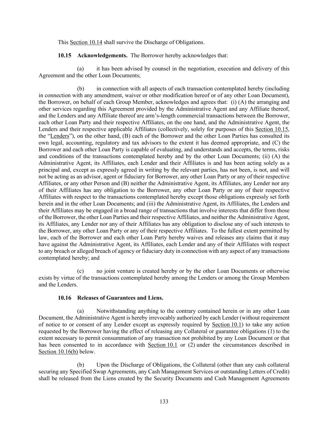 133 This Section 10.14 shall survive the Discharge of Obligations. Acknowledgements. The Borrower hereby acknowledges that: (a) it has been advised by counsel in the negotiation, execution and delivery of this Agreement and the other Loan Documents; (b) in connection with all aspects of each transaction contemplated hereby (including in connection with any amendment, waiver or other modification hereof or of any other Loan Document), the Borrower, on behalf of each Group Member, acknowledges and agrees that: (i) (A) the arranging and other services regarding this Agreement provided by the Administrative Agent and any Affiliate thereof, and the Lenders and any Affiliate thereof are arm’s-length commercial transactions between the Borrower, each other Loan Party and their respective Affiliates, on the one hand, and the Administrative Agent, the Lenders and their respective applicable Affiliates (collectively, solely for purposes of this Section 10.15, the “Lenders”), on the other hand, (B) each of the Borrower and the other Loan Parties has consulted its own legal, accounting, regulatory and tax advisors to the extent it has deemed appropriate, and (C) the Borrower and each other Loan Party is capable of evaluating, and understands and accepts, the terms, risks and conditions of the transactions contemplated hereby and by the other Loan Documents; (ii) (A) the Administrative Agent, its Affiliates, each Lender and their Affiliates is and has been acting solely as a principal and, except as expressly agreed in writing by the relevant parties, has not been, is not, and will not be acting as an advisor, agent or fiduciary for Borrower, any other Loan Party or any of their respective Affiliates, or any other Person and (B) neither the Administrative Agent, its Affiliates, any Lender nor any of their Affiliates has any obligation to the Borrower, any other Loan Party or any of their respective Affiliates with respect to the transactions contemplated hereby except those obligations expressly set forth herein and in the other Loan Documents; and (iii) the Administrative Agent, its Affiliates, the Lenders and their Affiliates may be engaged in a broad range of transactions that involve interests that differ from those of the Borrower, the other Loan Parties and their respective Affiliates, and neither the Administrative Agent, its Affiliates, any Lender nor any of their Affiliates has any obligation to disclose any of such interests to the Borrower, any other Loan Party or any of their respective Affiliates. To the fullest extent permitted by law, each of the Borrower and each other Loan Party hereby waives and releases any claims that it may have against the Administrative Agent, its Affiliates, each Lender and any of their Affiliates with respect to any breach or alleged breach of agency or fiduciary duty in connection with any aspect of any transactions contemplated hereby; and (c) no joint venture is created hereby or by the other Loan Documents or otherwise exists by virtue of the transactions contemplated hereby among the Lenders or among the Group Members and the Lenders. Releases of Guarantees and Liens. (a) Notwithstanding anything to the contrary contained herein or in any other Loan Document, the Administrative Agent is hereby irrevocably authorized by each Lender (without requirement of notice to or consent of any Lender except as expressly required by Section 10.1) to take any action requested by the Borrower having the effect of releasing any Collateral or guarantee obligations (1) to the extent necessary to permit consummation of any transaction not prohibited by any Loan Document or that has been consented to in accordance with Section 10.1 or (2) under the circumstances described in Section 10.16(b) below. (b) Upon the Discharge of Obligations, the Collateral (other than any cash collateral securing any Specified Swap Agreements, any Cash Management Services or outstanding Letters of Credit) shall be released from the Liens created by the Security Documents and Cash Management Agreements