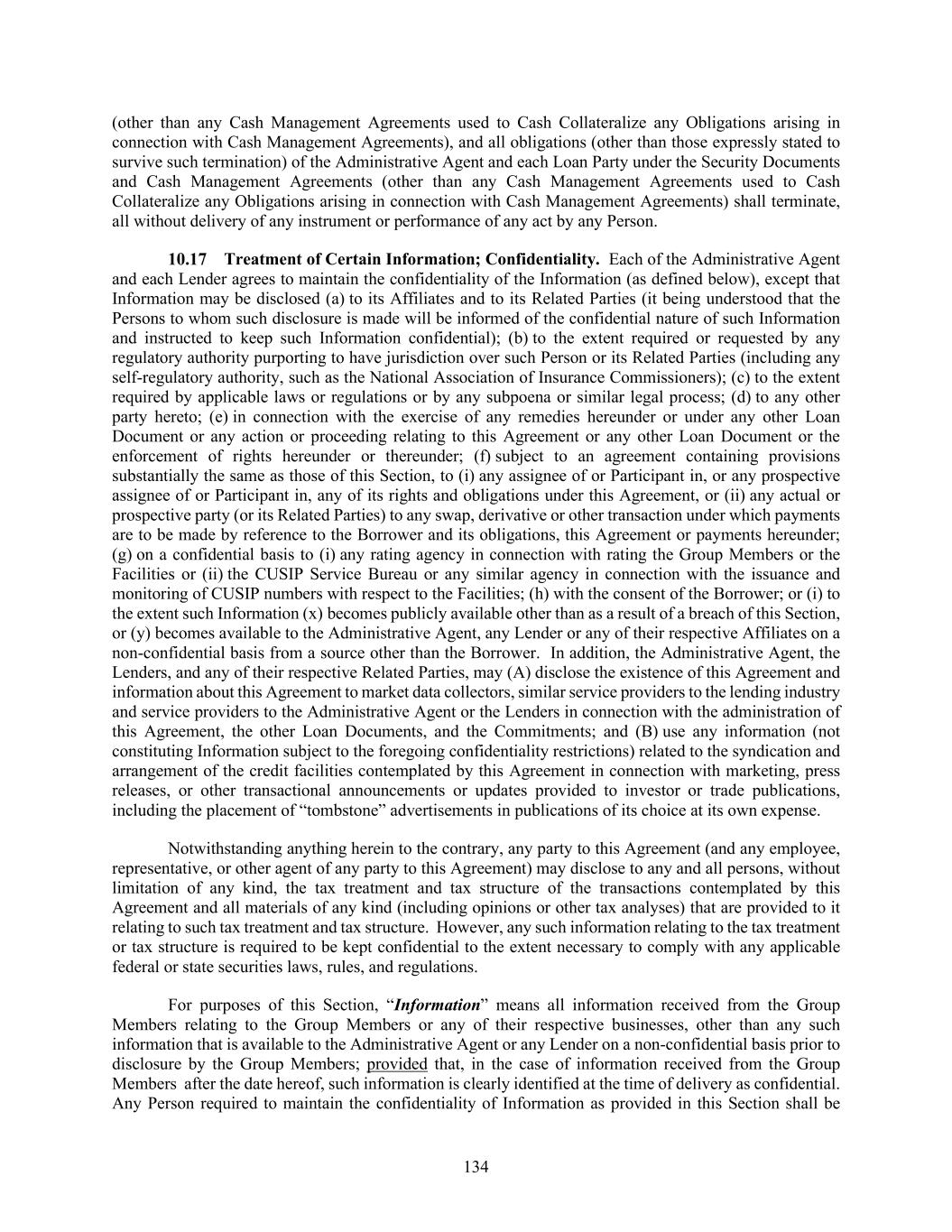 134 (other than any Cash Management Agreements used to Cash Collateralize any Obligations arising in connection with Cash Management Agreements), and all obligations (other than those expressly stated to survive such termination) of the Administrative Agent and each Loan Party under the Security Documents and Cash Management Agreements (other than any Cash Management Agreements used to Cash Collateralize any Obligations arising in connection with Cash Management Agreements) shall terminate, all without delivery of any instrument or performance of any act by any Person. Treatment of Certain Information; Confidentiality. Each of the Administrative Agent and each Lender agrees to maintain the confidentiality of the Information (as defined below), except that Information may be disclosed (a) to its Affiliates and to its Related Parties (it being understood that the Persons to whom such disclosure is made will be informed of the confidential nature of such Information and instructed to keep such Information confidential); (b) to the extent required or requested by any regulatory authority purporting to have jurisdiction over such Person or its Related Parties (including any self-regulatory authority, such as the National Association of Insurance Commissioners); (c) to the extent required by applicable laws or regulations or by any subpoena or similar legal process; (d) to any other party hereto; (e) in connection with the exercise of any remedies hereunder or under any other Loan Document or any action or proceeding relating to this Agreement or any other Loan Document or the enforcement of rights hereunder or thereunder; (f) subject to an agreement containing provisions substantially the same as those of this Section, to (i) any assignee of or Participant in, or any prospective assignee of or Participant in, any of its rights and obligations under this Agreement, or (ii) any actual or prospective party (or its Related Parties) to any swap, derivative or other transaction under which payments are to be made by reference to the Borrower and its obligations, this Agreement or payments hereunder; (g) on a confidential basis to (i) any rating agency in connection with rating the Group Members or the Facilities or (ii) the CUSIP Service Bureau or any similar agency in connection with the issuance and monitoring of CUSIP numbers with respect to the Facilities; (h) with the consent of the Borrower; or (i) to the extent such Information (x) becomes publicly available other than as a result of a breach of this Section, or (y) becomes available to the Administrative Agent, any Lender or any of their respective Affiliates on a non-confidential basis from a source other than the Borrower. In addition, the Administrative Agent, the Lenders, and any of their respective Related Parties, may (A) disclose the existence of this Agreement and information about this Agreement to market data collectors, similar service providers to the lending industry and service providers to the Administrative Agent or the Lenders in connection with the administration of this Agreement, the other Loan Documents, and the Commitments; and (B) use any information (not constituting Information subject to the foregoing confidentiality restrictions) related to the syndication and arrangement of the credit facilities contemplated by this Agreement in connection with marketing, press releases, or other transactional announcements or updates provided to investor or trade publications, including the placement of “tombstone” advertisements in publications of its choice at its own expense. Notwithstanding anything herein to the contrary, any party to this Agreement (and any employee, representative, or other agent of any party to this Agreement) may disclose to any and all persons, without limitation of any kind, the tax treatment and tax structure of the transactions contemplated by this Agreement and all materials of any kind (including opinions or other tax analyses) that are provided to it relating to such tax treatment and tax structure. However, any such information relating to the tax treatment or tax structure is required to be kept confidential to the extent necessary to comply with any applicable federal or state securities laws, rules, and regulations. For purposes of this Section, “Information” means all information received from the Group Members relating to the Group Members or any of their respective businesses, other than any such information that is available to the Administrative Agent or any Lender on a non-confidential basis prior to disclosure by the Group Members; provided that, in the case of information received from the Group Members after the date hereof, such information is clearly identified at the time of delivery as confidential. Any Person required to maintain the confidentiality of Information as provided in this Section shall be