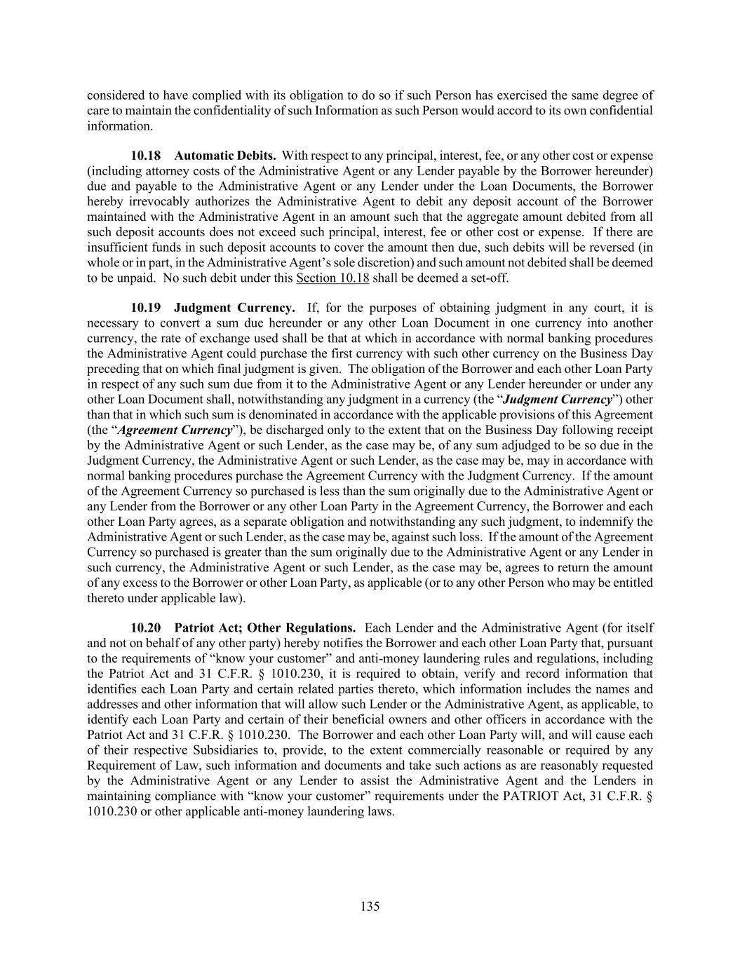 135 considered to have complied with its obligation to do so if such Person has exercised the same degree of care to maintain the confidentiality of such Information as such Person would accord to its own confidential information. Automatic Debits. With respect to any principal, interest, fee, or any other cost or expense (including attorney costs of the Administrative Agent or any Lender payable by the Borrower hereunder) due and payable to the Administrative Agent or any Lender under the Loan Documents, the Borrower hereby irrevocably authorizes the Administrative Agent to debit any deposit account of the Borrower maintained with the Administrative Agent in an amount such that the aggregate amount debited from all such deposit accounts does not exceed such principal, interest, fee or other cost or expense. If there are insufficient funds in such deposit accounts to cover the amount then due, such debits will be reversed (in whole or in part, in the Administrative Agent’s sole discretion) and such amount not debited shall be deemed to be unpaid. No such debit under this Section 10.18 shall be deemed a set-off. Judgment Currency. If, for the purposes of obtaining judgment in any court, it is necessary to convert a sum due hereunder or any other Loan Document in one currency into another currency, the rate of exchange used shall be that at which in accordance with normal banking procedures the Administrative Agent could purchase the first currency with such other currency on the Business Day preceding that on which final judgment is given. The obligation of the Borrower and each other Loan Party in respect of any such sum due from it to the Administrative Agent or any Lender hereunder or under any other Loan Document shall, notwithstanding any judgment in a currency (the “Judgment Currency”) other than that in which such sum is denominated in accordance with the applicable provisions of this Agreement (the “Agreement Currency”), be discharged only to the extent that on the Business Day following receipt by the Administrative Agent or such Lender, as the case may be, of any sum adjudged to be so due in the Judgment Currency, the Administrative Agent or such Lender, as the case may be, may in accordance with normal banking procedures purchase the Agreement Currency with the Judgment Currency. If the amount of the Agreement Currency so purchased is less than the sum originally due to the Administrative Agent or any Lender from the Borrower or any other Loan Party in the Agreement Currency, the Borrower and each other Loan Party agrees, as a separate obligation and notwithstanding any such judgment, to indemnify the Administrative Agent or such Lender, as the case may be, against such loss. If the amount of the Agreement Currency so purchased is greater than the sum originally due to the Administrative Agent or any Lender in such currency, the Administrative Agent or such Lender, as the case may be, agrees to return the amount of any excess to the Borrower or other Loan Party, as applicable (or to any other Person who may be entitled thereto under applicable law). Patriot Act; Other Regulations. Each Lender and the Administrative Agent (for itself and not on behalf of any other party) hereby notifies the Borrower and each other Loan Party that, pursuant to the requirements of “know your customer” and anti-money laundering rules and regulations, including the Patriot Act and 31 C.F.R. § 1010.230, it is required to obtain, verify and record information that identifies each Loan Party and certain related parties thereto, which information includes the names and addresses and other information that will allow such Lender or the Administrative Agent, as applicable, to identify each Loan Party and certain of their beneficial owners and other officers in accordance with the Patriot Act and 31 C.F.R. § 1010.230. The Borrower and each other Loan Party will, and will cause each of their respective Subsidiaries to, provide, to the extent commercially reasonable or required by any Requirement of Law, such information and documents and take such actions as are reasonably requested by the Administrative Agent or any Lender to assist the Administrative Agent and the Lenders in maintaining compliance with “know your customer” requirements under the PATRIOT Act, 31 C.F.R. § 1010.230 or other applicable anti-money laundering laws.