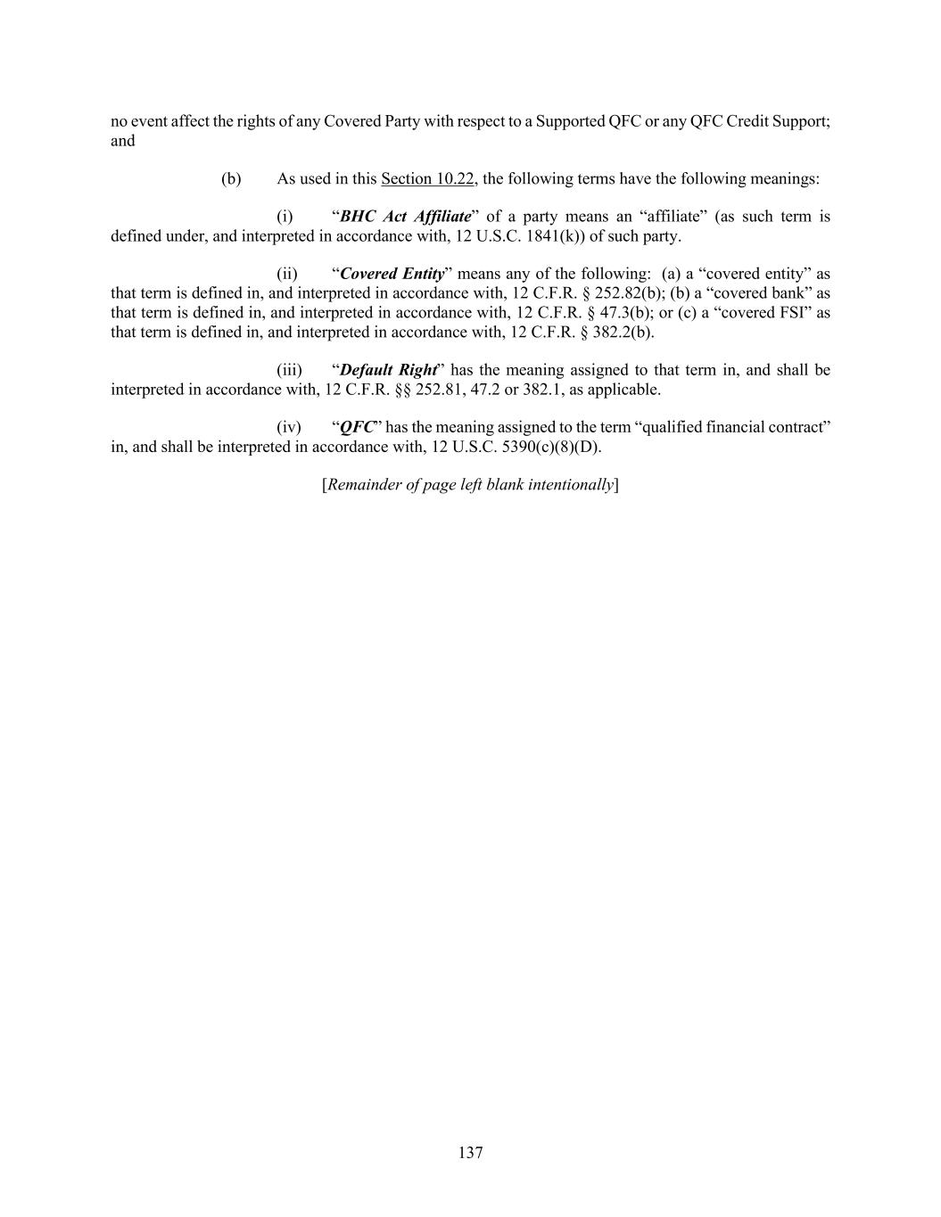 137 no event affect the rights of any Covered Party with respect to a Supported QFC or any QFC Credit Support; and (b) As used in this Section 10.22, the following terms have the following meanings: (i) “BHC Act Affiliate” of a party means an “affiliate” (as such term is defined under, and interpreted in accordance with, 12 U.S.C. 1841(k)) of such party. (ii) “Covered Entity” means any of the following: (a) a “covered entity” as that term is defined in, and interpreted in accordance with, 12 C.F.R. § 252.82(b); (b) a “covered bank” as that term is defined in, and interpreted in accordance with, 12 C.F.R. § 47.3(b); or (c) a “covered FSI” as that term is defined in, and interpreted in accordance with, 12 C.F.R. § 382.2(b). (iii) “Default Right” has the meaning assigned to that term in, and shall be interpreted in accordance with, 12 C.F.R. §§ 252.81, 47.2 or 382.1, as applicable. (iv) “QFC” has the meaning assigned to the term “qualified financial contract” in, and shall be interpreted in accordance with, 12 U.S.C. 5390(c)(8)(D). [Remainder of page left blank intentionally]