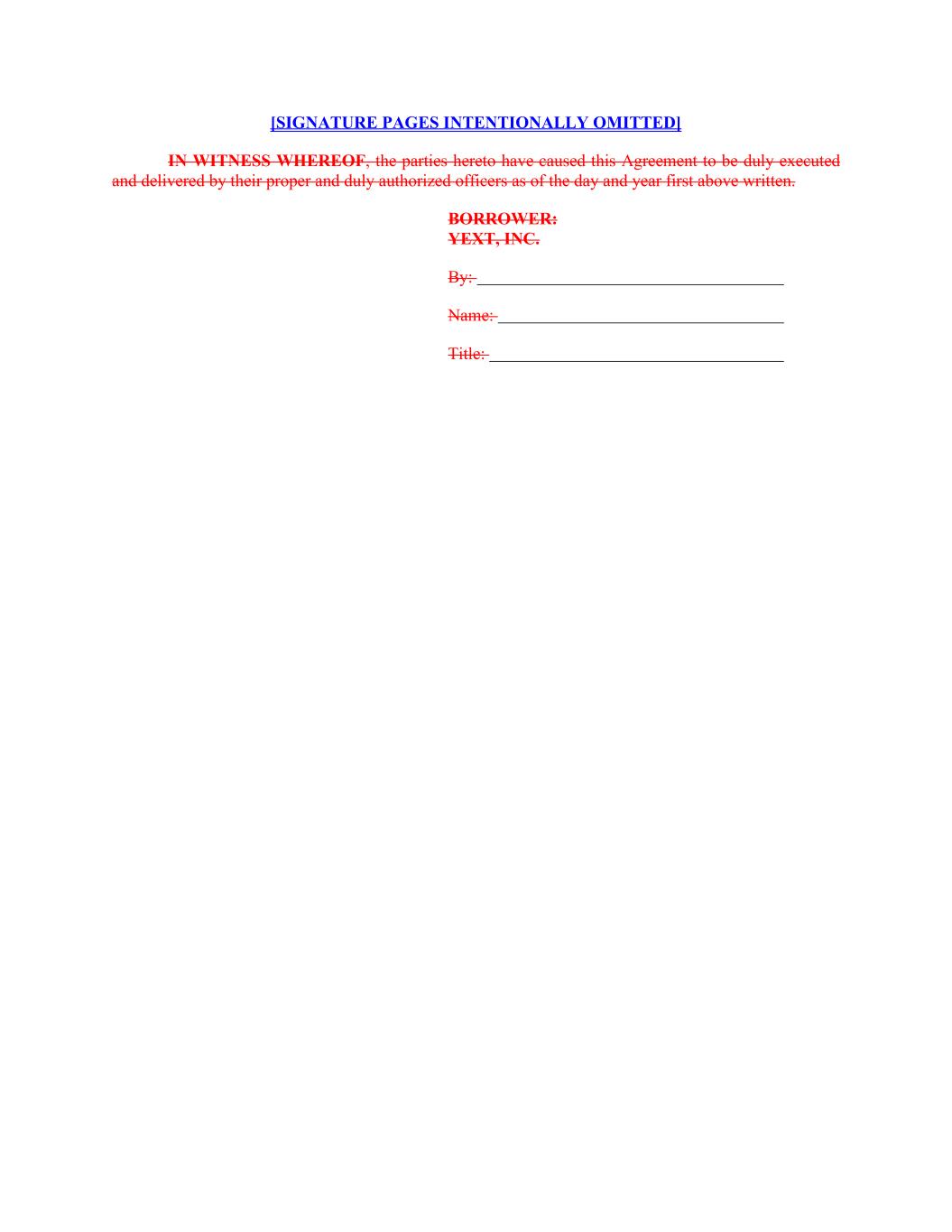 [SIGNATURE PAGES INTENTIONALLY OMITTED] IN WITNESS WHEREOF, the parties hereto have caused this Agreement to be duly executed and delivered by their proper and duly authorized officers as of the day and year first above written. BORROWER: YEXT, INC. By: Name: Title: