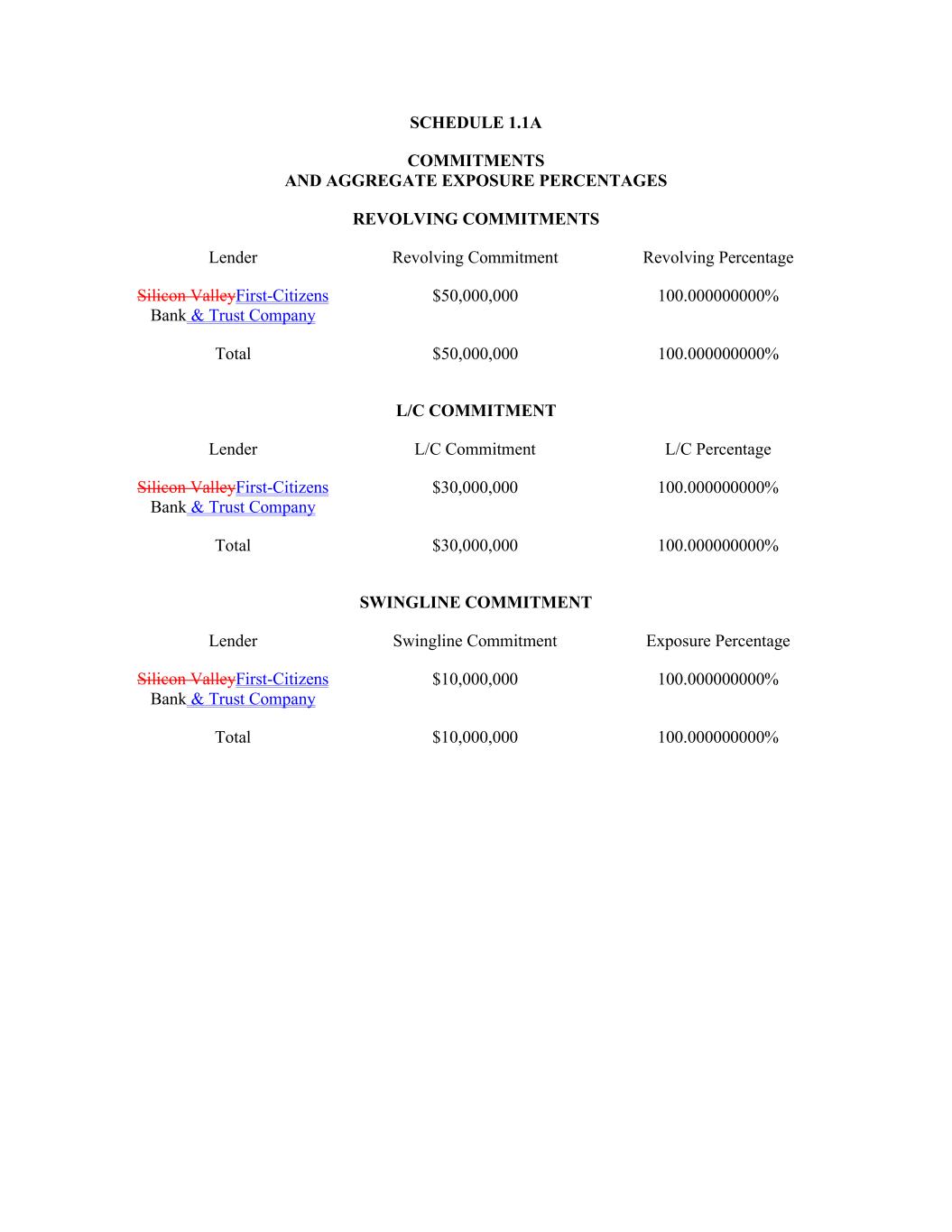 SCHEDULE 1.1A COMMITMENTS AND AGGREGATE EXPOSURE PERCENTAGES REVOLVING COMMITMENTS Lender Revolving Commitment Revolving Percentage Silicon ValleyFirst-Citizens Bank & Trust Company $50,000,000 100.000000000% Total $50,000,000 100.000000000% L/C COMMITMENT Lender L/C Commitment L/C Percentage Silicon ValleyFirst-Citizens Bank & Trust Company $30,000,000 100.000000000% Total $30,000,000 100.000000000% SWINGLINE COMMITMENT Lender Swingline Commitment Exposure Percentage Silicon ValleyFirst-Citizens Bank & Trust Company $10,000,000 100.000000000% Total $10,000,000 100.000000000%
