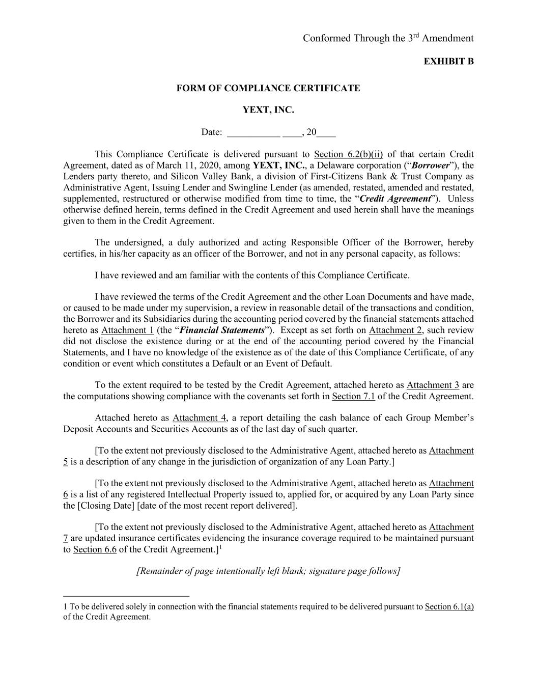 Conformed Through the 3rd Amendment EXHIBIT B FORM OF COMPLIANCE CERTIFICATE YEXT, INC. Date: ___________ ____, 20____ This Compliance Certificate is delivered pursuant to Section 6.2(b)(ii) of that certain Credit Agreement, dated as of March 11, 2020, among YEXT, INC., a Delaware corporation (“Borrower”), the Lenders party thereto, and Silicon Valley Bank, a division of First-Citizens Bank & Trust Company as Administrative Agent, Issuing Lender and Swingline Lender (as amended, restated, amended and restated, supplemented, restructured or otherwise modified from time to time, the “Credit Agreement”). Unless otherwise defined herein, terms defined in the Credit Agreement and used herein shall have the meanings given to them in the Credit Agreement. The undersigned, a duly authorized and acting Responsible Officer of the Borrower, hereby certifies, in his/her capacity as an officer of the Borrower, and not in any personal capacity, as follows: I have reviewed and am familiar with the contents of this Compliance Certificate. I have reviewed the terms of the Credit Agreement and the other Loan Documents and have made, or caused to be made under my supervision, a review in reasonable detail of the transactions and condition, the Borrower and its Subsidiaries during the accounting period covered by the financial statements attached hereto as Attachment 1 (the “Financial Statements”). Except as set forth on Attachment 2, such review did not disclose the existence during or at the end of the accounting period covered by the Financial Statements, and I have no knowledge of the existence as of the date of this Compliance Certificate, of any condition or event which constitutes a Default or an Event of Default. To the extent required to be tested by the Credit Agreement, attached hereto as Attachment 3 are the computations showing compliance with the covenants set forth in Section 7.1 of the Credit Agreement. Attached hereto as Attachment 4, a report detailing the cash balance of each Group Member’s Deposit Accounts and Securities Accounts as of the last day of such quarter. [To the extent not previously disclosed to the Administrative Agent, attached hereto as Attachment 5 is a description of any change in the jurisdiction of organization of any Loan Party.] [To the extent not previously disclosed to the Administrative Agent, attached hereto as Attachment 6 is a list of any registered Intellectual Property issued to, applied for, or acquired by any Loan Party since the [Closing Date] [date of the most recent report delivered]. [To the extent not previously disclosed to the Administrative Agent, attached hereto as Attachment 7 are updated insurance certificates evidencing the insurance coverage required to be maintained pursuant to Section 6.6 of the Credit Agreement.]1 [Remainder of page intentionally left blank; signature page follows] 1 To be delivered solely in connection with the financial statements required to be delivered pursuant to Section 6.1(a) of the Credit Agreement.