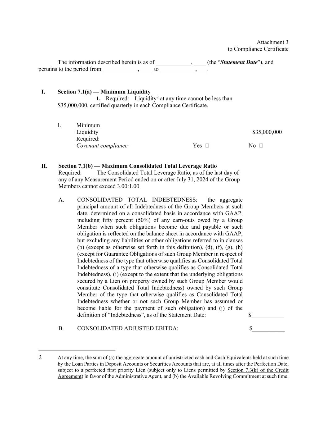 Attachment 3 to Compliance Certificate The information described herein is as of ____________, ____ (the “Statement Date”), and pertains to the period from ____________, ____ to ____________, ___. I. Section 7.1(a) — Minimum Liquidity 1. Required: Liquidity2 at any time cannot be less than $35,000,000, certified quarterly in each Compliance Certificate. I. Minimum Liquidity Required: $35,000,000 Covenant compliance: Yes No II. Section 7.1(b) — Maximum Consolidated Total Leverage Ratio Required: The Consolidated Total Leverage Ratio, as of the last day of any of any Measurement Period ended on or after July 31, 2024 of the Group Members cannot exceed 3.00:1.00 A. CONSOLIDATED TOTAL INDEBTEDNESS: the aggregate principal amount of all Indebtedness of the Group Members at such date, determined on a consolidated basis in accordance with GAAP, including fifty percent (50%) of any earn-outs owed by a Group Member when such obligations become due and payable or such obligation is reflected on the balance sheet in accordance with GAAP, but excluding any liabilities or other obligations referred to in clauses (b) (except as otherwise set forth in this definition), (d), (f), (g), (h) (except for Guarantee Obligations of such Group Member in respect of Indebtedness of the type that otherwise qualifies as Consolidated Total Indebtedness of a type that otherwise qualifies as Consolidated Total Indebtedness), (i) (except to the extent that the underlying obligations secured by a Lien on property owned by such Group Member would constitute Consolidated Total Indebtedness) owned by such Group Member of the type that otherwise qualifies as Consolidated Total Indebtedness whether or not such Group Member has assumed or become liable for the payment of such obligation) and (j) of the definition of “Indebtedness”, as of the Statement Date: $___________ B. CONSOLIDATED ADJUSTED EBITDA: $___________ 2 At any time, the sum of (a) the aggregate amount of unrestricted cash and Cash Equivalents held at such time by the Loan Parties in Deposit Accounts or Securities Accounts that are, at all times after the Perfection Date, subject to a perfected first priority Lien (subject only to Liens permitted by Section 7.3(k) of the Credit Agreement) in favor of the Administrative Agent, and (b) the Available Revolving Commitment at such time.