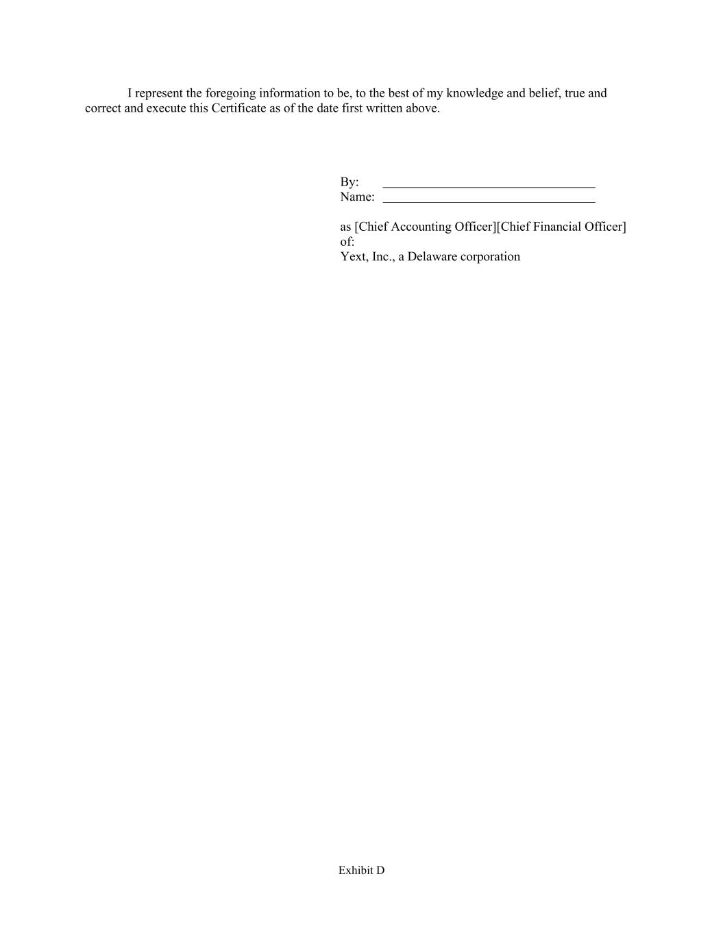 Exhibit D I represent the foregoing information to be, to the best of my knowledge and belief, true and correct and execute this Certificate as of the date first written above. By: Name: as [Chief Accounting Officer][Chief Financial Officer] of: Yext, Inc., a Delaware corporation