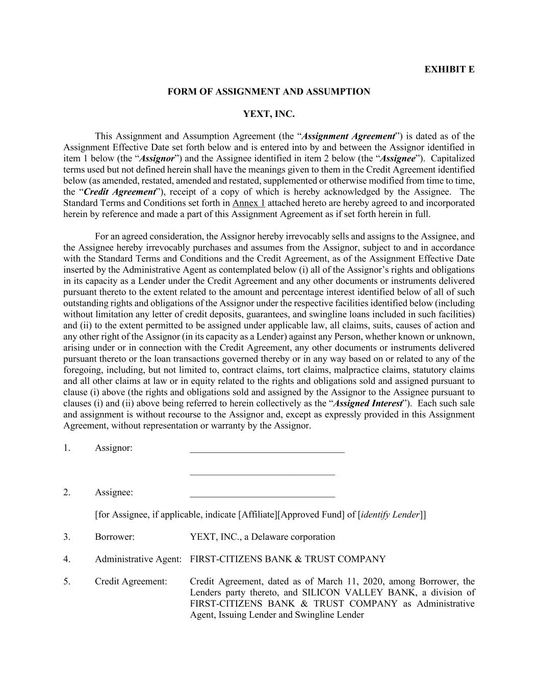 EXHIBIT E FORM OF ASSIGNMENT AND ASSUMPTION YEXT, INC. This Assignment and Assumption Agreement (the “Assignment Agreement”) is dated as of the Assignment Effective Date set forth below and is entered into by and between the Assignor identified in item 1 below (the “Assignor”) and the Assignee identified in item 2 below (the “Assignee”). Capitalized terms used but not defined herein shall have the meanings given to them in the Credit Agreement identified below (as amended, restated, amended and restated, supplemented or otherwise modified from time to time, the “Credit Agreement”), receipt of a copy of which is hereby acknowledged by the Assignee. The Standard Terms and Conditions set forth in Annex 1 attached hereto are hereby agreed to and incorporated herein by reference and made a part of this Assignment Agreement as if set forth herein in full. For an agreed consideration, the Assignor hereby irrevocably sells and assigns to the Assignee, and the Assignee hereby irrevocably purchases and assumes from the Assignor, subject to and in accordance with the Standard Terms and Conditions and the Credit Agreement, as of the Assignment Effective Date inserted by the Administrative Agent as contemplated below (i) all of the Assignor’s rights and obligations in its capacity as a Lender under the Credit Agreement and any other documents or instruments delivered pursuant thereto to the extent related to the amount and percentage interest identified below of all of such outstanding rights and obligations of the Assignor under the respective facilities identified below (including without limitation any letter of credit deposits, guarantees, and swingline loans included in such facilities) and (ii) to the extent permitted to be assigned under applicable law, all claims, suits, causes of action and any other right of the Assignor (in its capacity as a Lender) against any Person, whether known or unknown, arising under or in connection with the Credit Agreement, any other documents or instruments delivered pursuant thereto or the loan transactions governed thereby or in any way based on or related to any of the foregoing, including, but not limited to, contract claims, tort claims, malpractice claims, statutory claims and all other claims at law or in equity related to the rights and obligations sold and assigned pursuant to clause (i) above (the rights and obligations sold and assigned by the Assignor to the Assignee pursuant to clauses (i) and (ii) above being referred to herein collectively as the “Assigned Interest”). Each such sale and assignment is without recourse to the Assignor and, except as expressly provided in this Assignment Agreement, without representation or warranty by the Assignor. 1. Assignor: ________________________________ ______________________________ 2. Assignee: ______________________________ [for Assignee, if applicable, indicate [Affiliate][Approved Fund] of [identify Lender]] 3. Borrower: YEXT, INC., a Delaware corporation 4. Administrative Agent: FIRST-CITIZENS BANK & TRUST COMPANY 5. Credit Agreement: Credit Agreement, dated as of March 11, 2020, among Borrower, the Lenders party thereto, and SILICON VALLEY BANK, a division of FIRST-CITIZENS BANK & TRUST COMPANY as Administrative Agent, Issuing Lender and Swingline Lender