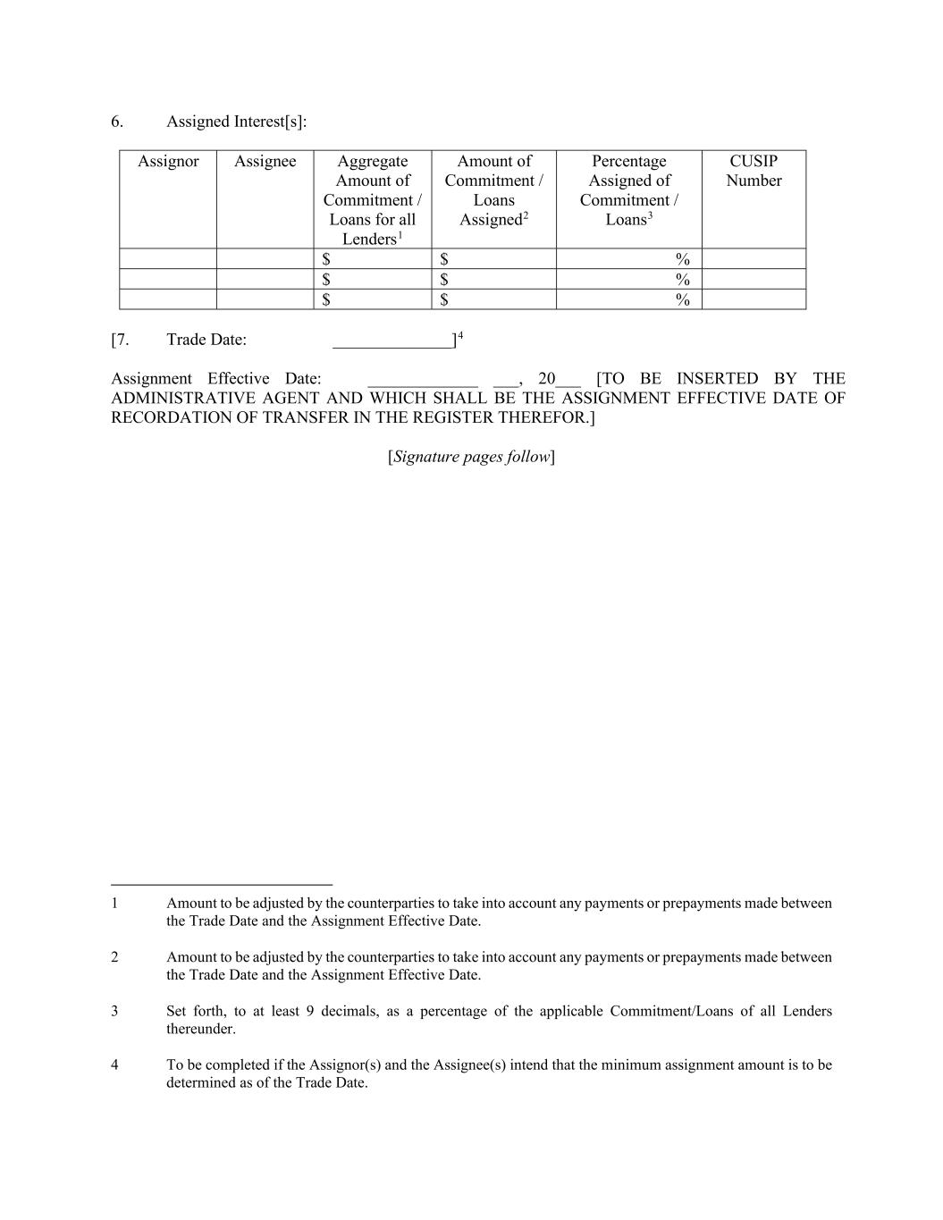 6. Assigned Interest[s]: Assignor Assignee Aggregate Amount of Commitment / Loans for all Lenders1 Amount of Commitment / Loans Assigned2 Percentage Assigned of Commitment / Loans3 CUSIP Number $ $ % $ $ % $ $ % [7. Trade Date: ______________]4 Assignment Effective Date: _____________ ___, 20___ [TO BE INSERTED BY THE ADMINISTRATIVE AGENT AND WHICH SHALL BE THE ASSIGNMENT EFFECTIVE DATE OF RECORDATION OF TRANSFER IN THE REGISTER THEREFOR.] [Signature pages follow] 1 Amount to be adjusted by the counterparties to take into account any payments or prepayments made between the Trade Date and the Assignment Effective Date. 2 Amount to be adjusted by the counterparties to take into account any payments or prepayments made between the Trade Date and the Assignment Effective Date. 3 Set forth, to at least 9 decimals, as a percentage of the applicable Commitment/Loans of all Lenders thereunder. 4 To be completed if the Assignor(s) and the Assignee(s) intend that the minimum assignment amount is to be determined as of the Trade Date.