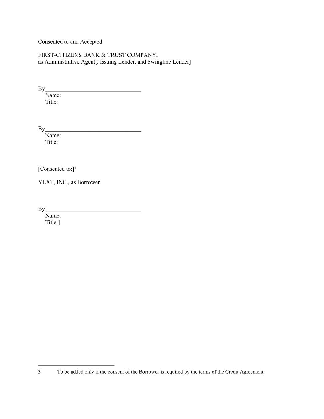 Consented to and Accepted: FIRST-CITIZENS BANK & TRUST COMPANY, as Administrative Agent[, Issuing Lender, and Swingline Lender] By_________________________________ Name: Title: By_________________________________ Name: Title: [Consented to:]3 YEXT, INC., as Borrower By_________________________________ Name: Title:] 3 To be added only if the consent of the Borrower is required by the terms of the Credit Agreement.