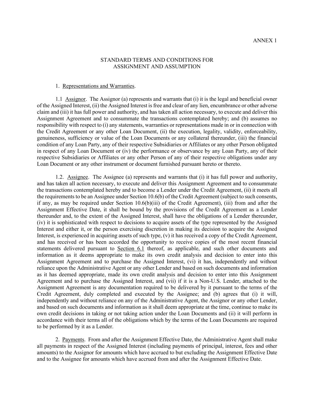 ANNEX 1 STANDARD TERMS AND CONDITIONS FOR ASSIGNMENT AND ASSUMPTION 1. Representations and Warranties. 1.1 Assignor. The Assignor (a) represents and warrants that (i) it is the legal and beneficial owner of the Assigned Interest, (ii) the Assigned Interest is free and clear of any lien, encumbrance or other adverse claim and (iii) it has full power and authority, and has taken all action necessary, to execute and deliver this Assignment Agreement and to consummate the transactions contemplated hereby; and (b) assumes no responsibility with respect to (i) any statements, warranties or representations made in or in connection with the Credit Agreement or any other Loan Document, (ii) the execution, legality, validity, enforceability, genuineness, sufficiency or value of the Loan Documents or any collateral thereunder, (iii) the financial condition of any Loan Party, any of their respective Subsidiaries or Affiliates or any other Person obligated in respect of any Loan Document or (iv) the performance or observance by any Loan Party, any of their respective Subsidiaries or Affiliates or any other Person of any of their respective obligations under any Loan Document or any other instrument or document furnished pursuant hereto or thereto. 1.2. Assignee. The Assignee (a) represents and warrants that (i) it has full power and authority, and has taken all action necessary, to execute and deliver this Assignment Agreement and to consummate the transactions contemplated hereby and to become a Lender under the Credit Agreement, (ii) it meets all the requirements to be an Assignee under Section 10.6(b) of the Credit Agreement (subject to such consents, if any, as may be required under Section 10.6(b)(iii) of the Credit Agreement), (iii) from and after the Assignment Effective Date, it shall be bound by the provisions of the Credit Agreement as a Lender thereunder and, to the extent of the Assigned Interest, shall have the obligations of a Lender thereunder, (iv) it is sophisticated with respect to decisions to acquire assets of the type represented by the Assigned Interest and either it, or the person exercising discretion in making its decision to acquire the Assigned Interest, is experienced in acquiring assets of such type, (v) it has received a copy of the Credit Agreement, and has received or has been accorded the opportunity to receive copies of the most recent financial statements delivered pursuant to Section 6.1 thereof, as applicable, and such other documents and information as it deems appropriate to make its own credit analysis and decision to enter into this Assignment Agreement and to purchase the Assigned Interest, (vi) it has, independently and without reliance upon the Administrative Agent or any other Lender and based on such documents and information as it has deemed appropriate, made its own credit analysis and decision to enter into this Assignment Agreement and to purchase the Assigned Interest, and (vii) if it is a Non-U.S. Lender, attached to the Assignment Agreement is any documentation required to be delivered by it pursuant to the terms of the Credit Agreement, duly completed and executed by the Assignee; and (b) agrees that (i) it will, independently and without reliance on any of the Administrative Agent, the Assignor or any other Lender, and based on such documents and information as it shall deem appropriate at the time, continue to make its own credit decisions in taking or not taking action under the Loan Documents and (ii) it will perform in accordance with their terms all of the obligations which by the terms of the Loan Documents are required to be performed by it as a Lender. 2. Payments. From and after the Assignment Effective Date, the Administrative Agent shall make all payments in respect of the Assigned Interest (including payments of principal, interest, fees and other amounts) to the Assignor for amounts which have accrued to but excluding the Assignment Effective Date and to the Assignee for amounts which have accrued from and after the Assignment Effective Date.