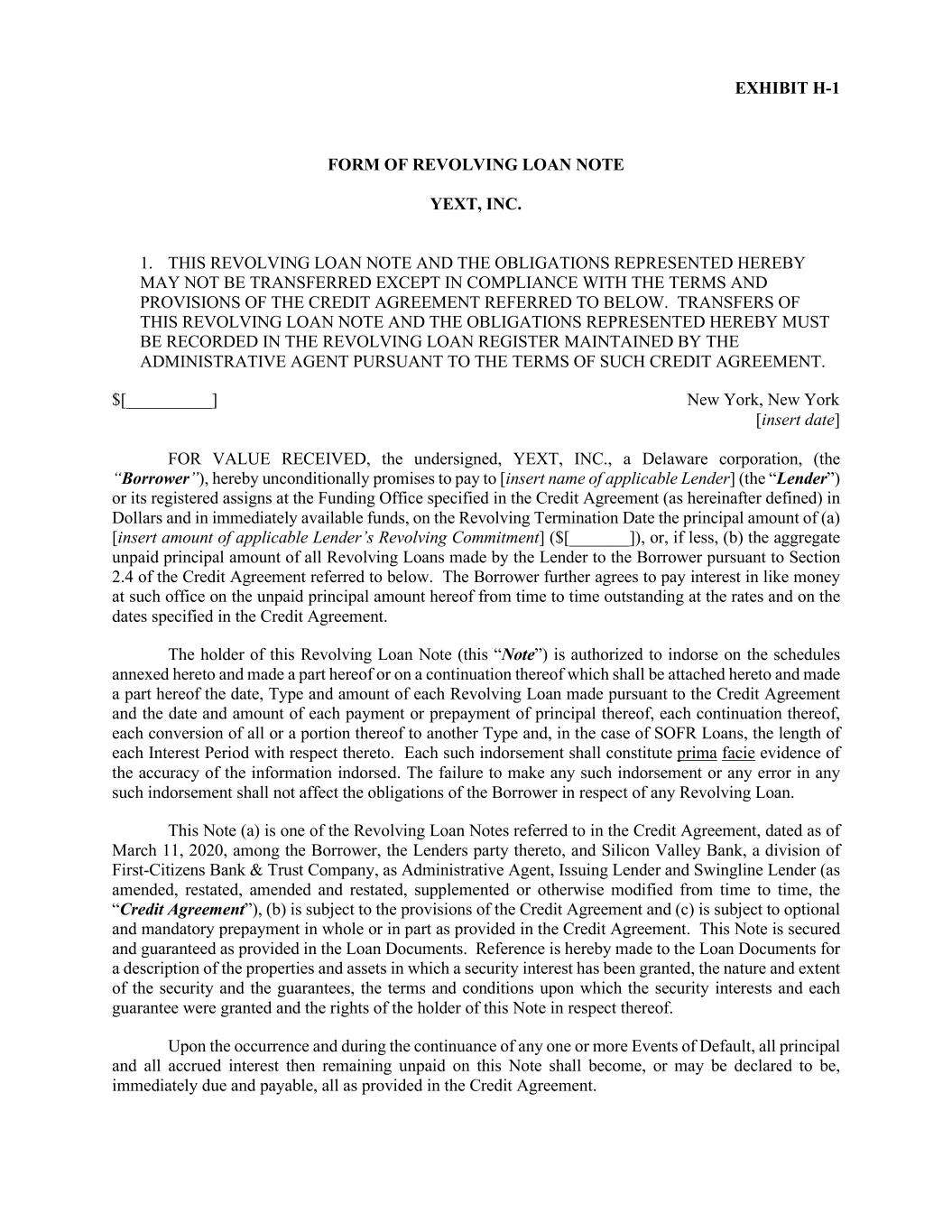 EXHIBIT H-1 FORM OF REVOLVING LOAN NOTE YEXT, INC. 1. THIS REVOLVING LOAN NOTE AND THE OBLIGATIONS REPRESENTED HEREBY MAY NOT BE TRANSFERRED EXCEPT IN COMPLIANCE WITH THE TERMS AND PROVISIONS OF THE CREDIT AGREEMENT REFERRED TO BELOW. TRANSFERS OF THIS REVOLVING LOAN NOTE AND THE OBLIGATIONS REPRESENTED HEREBY MUST BE RECORDED IN THE REVOLVING LOAN REGISTER MAINTAINED BY THE ADMINISTRATIVE AGENT PURSUANT TO THE TERMS OF SUCH CREDIT AGREEMENT. $[__________] New York, New York [insert date] FOR VALUE RECEIVED, the undersigned, YEXT, INC., a Delaware corporation, (the “Borrower”), hereby unconditionally promises to pay to [insert name of applicable Lender] (the “Lender”) or its registered assigns at the Funding Office specified in the Credit Agreement (as hereinafter defined) in Dollars and in immediately available funds, on the Revolving Termination Date the principal amount of (a) [insert amount of applicable Lender’s Revolving Commitment] ($[_______]), or, if less, (b) the aggregate unpaid principal amount of all Revolving Loans made by the Lender to the Borrower pursuant to Section 2.4 of the Credit Agreement referred to below. The Borrower further agrees to pay interest in like money at such office on the unpaid principal amount hereof from time to time outstanding at the rates and on the dates specified in the Credit Agreement. The holder of this Revolving Loan Note (this “Note”) is authorized to indorse on the schedules annexed hereto and made a part hereof or on a continuation thereof which shall be attached hereto and made a part hereof the date, Type and amount of each Revolving Loan made pursuant to the Credit Agreement and the date and amount of each payment or prepayment of principal thereof, each continuation thereof, each conversion of all or a portion thereof to another Type and, in the case of SOFR Loans, the length of each Interest Period with respect thereto. Each such indorsement shall constitute prima facie evidence of the accuracy of the information indorsed. The failure to make any such indorsement or any error in any such indorsement shall not affect the obligations of the Borrower in respect of any Revolving Loan. This Note (a) is one of the Revolving Loan Notes referred to in the Credit Agreement, dated as of March 11, 2020, among the Borrower, the Lenders party thereto, and Silicon Valley Bank, a division of First-Citizens Bank & Trust Company, as Administrative Agent, Issuing Lender and Swingline Lender (as amended, restated, amended and restated, supplemented or otherwise modified from time to time, the “Credit Agreement”), (b) is subject to the provisions of the Credit Agreement and (c) is subject to optional and mandatory prepayment in whole or in part as provided in the Credit Agreement. This Note is secured and guaranteed as provided in the Loan Documents. Reference is hereby made to the Loan Documents for a description of the properties and assets in which a security interest has been granted, the nature and extent of the security and the guarantees, the terms and conditions upon which the security interests and each guarantee were granted and the rights of the holder of this Note in respect thereof. Upon the occurrence and during the continuance of any one or more Events of Default, all principal and all accrued interest then remaining unpaid on this Note shall become, or may be declared to be, immediately due and payable, all as provided in the Credit Agreement.