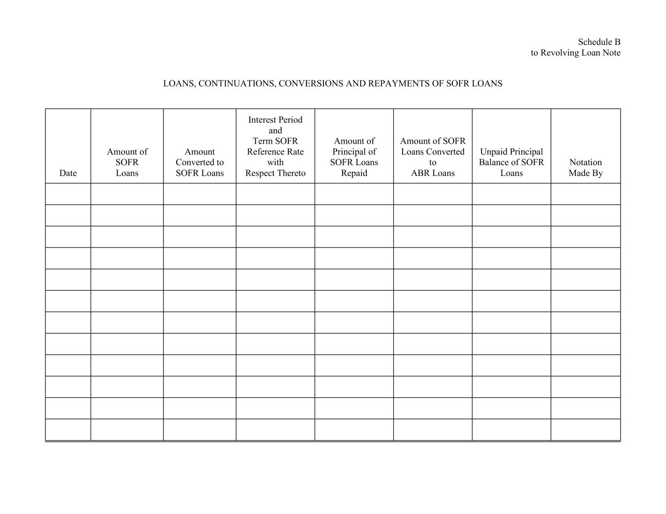 Schedule B to Revolving Loan Note LOANS, CONTINUATIONS, CONVERSIONS AND REPAYMENTS OF SOFR LOANS Date Amount of SOFR Loans Amount Converted to SOFR Loans Interest Period and Term SOFR Reference Rate with Respect Thereto Amount of Principal of SOFR Loans Repaid Amount of SOFR Loans Converted to ABR Loans Unpaid Principal Balance of SOFR Loans Notation Made By