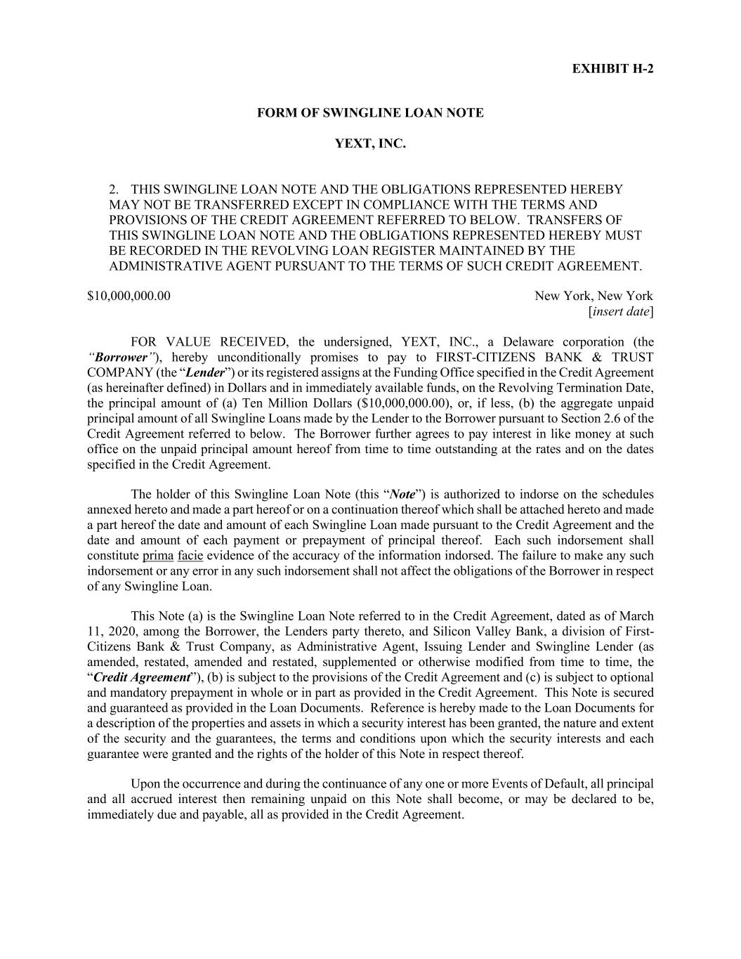 EXHIBIT H-2 FORM OF SWINGLINE LOAN NOTE YEXT, INC. 2. THIS SWINGLINE LOAN NOTE AND THE OBLIGATIONS REPRESENTED HEREBY MAY NOT BE TRANSFERRED EXCEPT IN COMPLIANCE WITH THE TERMS AND PROVISIONS OF THE CREDIT AGREEMENT REFERRED TO BELOW. TRANSFERS OF THIS SWINGLINE LOAN NOTE AND THE OBLIGATIONS REPRESENTED HEREBY MUST BE RECORDED IN THE REVOLVING LOAN REGISTER MAINTAINED BY THE ADMINISTRATIVE AGENT PURSUANT TO THE TERMS OF SUCH CREDIT AGREEMENT. $10,000,000.00 New York, New York [insert date] FOR VALUE RECEIVED, the undersigned, YEXT, INC., a Delaware corporation (the “Borrower”), hereby unconditionally promises to pay to FIRST-CITIZENS BANK & TRUST COMPANY (the “Lender”) or its registered assigns at the Funding Office specified in the Credit Agreement (as hereinafter defined) in Dollars and in immediately available funds, on the Revolving Termination Date, the principal amount of (a) Ten Million Dollars ($10,000,000.00), or, if less, (b) the aggregate unpaid principal amount of all Swingline Loans made by the Lender to the Borrower pursuant to Section 2.6 of the Credit Agreement referred to below. The Borrower further agrees to pay interest in like money at such office on the unpaid principal amount hereof from time to time outstanding at the rates and on the dates specified in the Credit Agreement. The holder of this Swingline Loan Note (this “Note”) is authorized to indorse on the schedules annexed hereto and made a part hereof or on a continuation thereof which shall be attached hereto and made a part hereof the date and amount of each Swingline Loan made pursuant to the Credit Agreement and the date and amount of each payment or prepayment of principal thereof. Each such indorsement shall constitute prima facie evidence of the accuracy of the information indorsed. The failure to make any such indorsement or any error in any such indorsement shall not affect the obligations of the Borrower in respect of any Swingline Loan. This Note (a) is the Swingline Loan Note referred to in the Credit Agreement, dated as of March 11, 2020, among the Borrower, the Lenders party thereto, and Silicon Valley Bank, a division of First- Citizens Bank & Trust Company, as Administrative Agent, Issuing Lender and Swingline Lender (as amended, restated, amended and restated, supplemented or otherwise modified from time to time, the “Credit Agreement”), (b) is subject to the provisions of the Credit Agreement and (c) is subject to optional and mandatory prepayment in whole or in part as provided in the Credit Agreement. This Note is secured and guaranteed as provided in the Loan Documents. Reference is hereby made to the Loan Documents for a description of the properties and assets in which a security interest has been granted, the nature and extent of the security and the guarantees, the terms and conditions upon which the security interests and each guarantee were granted and the rights of the holder of this Note in respect thereof. Upon the occurrence and during the continuance of any one or more Events of Default, all principal and all accrued interest then remaining unpaid on this Note shall become, or may be declared to be, immediately due and payable, all as provided in the Credit Agreement.