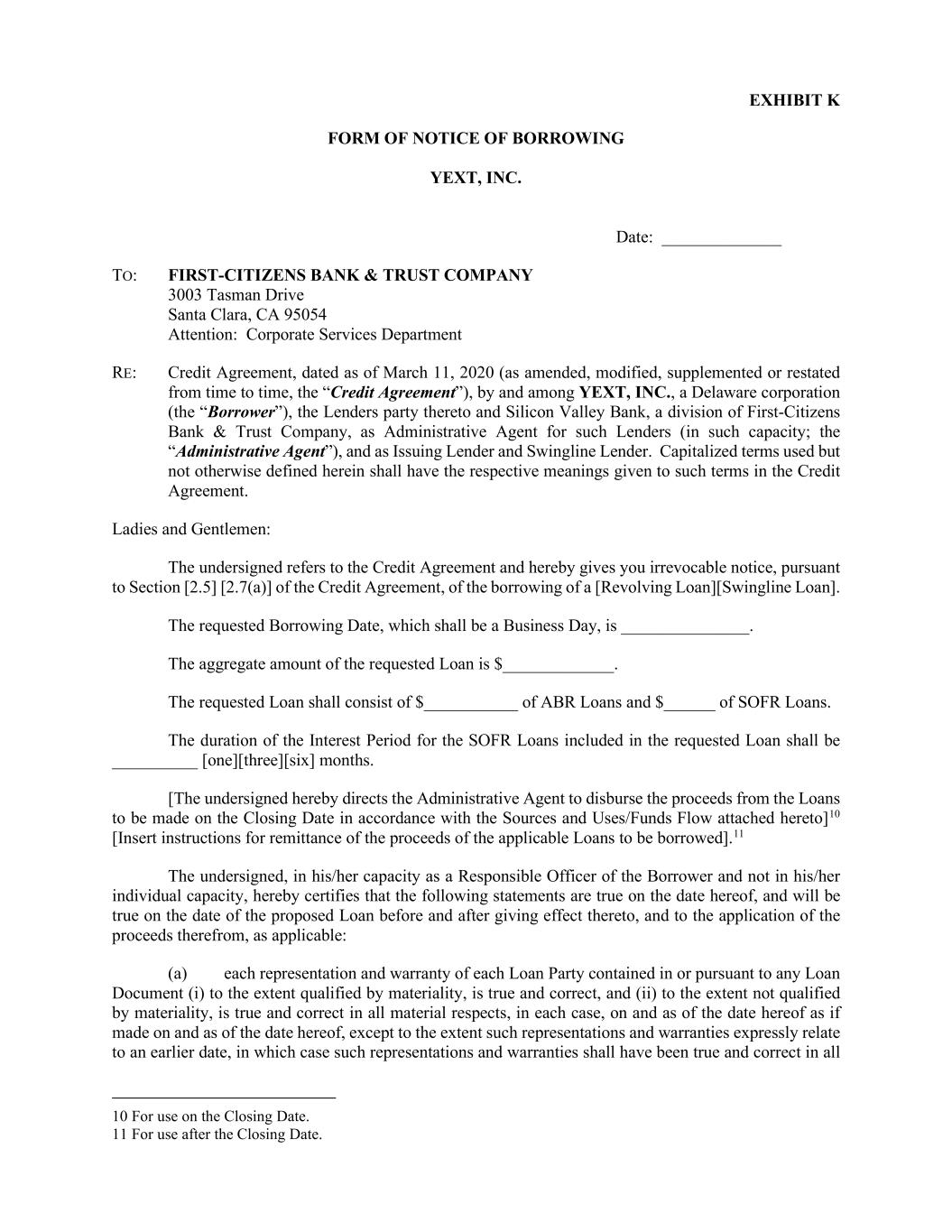 EXHIBIT K FORM OF NOTICE OF BORROWING YEXT, INC. Date: ______________ TO: FIRST-CITIZENS BANK & TRUST COMPANY 3003 Tasman Drive Santa Clara, CA 95054 Attention: Corporate Services Department RE: Credit Agreement, dated as of March 11, 2020 (as amended, modified, supplemented or restated from time to time, the “Credit Agreement”), by and among YEXT, INC., a Delaware corporation (the “Borrower”), the Lenders party thereto and Silicon Valley Bank, a division of First-Citizens Bank & Trust Company, as Administrative Agent for such Lenders (in such capacity; the “Administrative Agent”), and as Issuing Lender and Swingline Lender. Capitalized terms used but not otherwise defined herein shall have the respective meanings given to such terms in the Credit Agreement. Ladies and Gentlemen: The undersigned refers to the Credit Agreement and hereby gives you irrevocable notice, pursuant to Section [2.5] [2.7(a)] of the Credit Agreement, of the borrowing of a [Revolving Loan][Swingline Loan]. The requested Borrowing Date, which shall be a Business Day, is _______________. The aggregate amount of the requested Loan is $_____________. The requested Loan shall consist of $___________ of ABR Loans and $______ of SOFR Loans. The duration of the Interest Period for the SOFR Loans included in the requested Loan shall be __________ [one][three][six] months. [The undersigned hereby directs the Administrative Agent to disburse the proceeds from the Loans to be made on the Closing Date in accordance with the Sources and Uses/Funds Flow attached hereto]10 [Insert instructions for remittance of the proceeds of the applicable Loans to be borrowed].11 The undersigned, in his/her capacity as a Responsible Officer of the Borrower and not in his/her individual capacity, hereby certifies that the following statements are true on the date hereof, and will be true on the date of the proposed Loan before and after giving effect thereto, and to the application of the proceeds therefrom, as applicable: (a) each representation and warranty of each Loan Party contained in or pursuant to any Loan Document (i) to the extent qualified by materiality, is true and correct, and (ii) to the extent not qualified by materiality, is true and correct in all material respects, in each case, on and as of the date hereof as if made on and as of the date hereof, except to the extent such representations and warranties expressly relate to an earlier date, in which case such representations and warranties shall have been true and correct in all 10 For use on the Closing Date. 11 For use after the Closing Date.