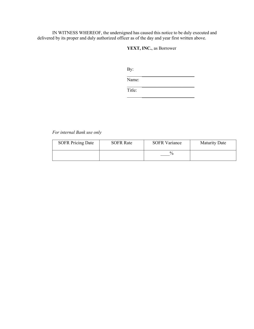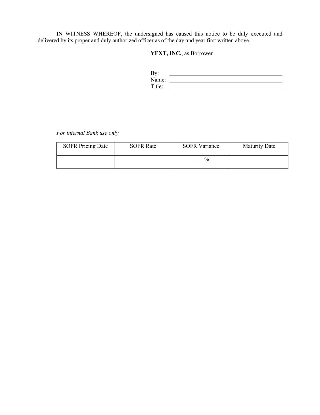 IN WITNESS WHEREOF, the undersigned has caused this notice to be duly executed and delivered by its proper and duly authorized officer as of the day and year first written above. YEXT, INC., as Borrower By: _______________________ Name: _______________________ Title: _______________________ For internal Bank use only SOFR Pricing Date SOFR Rate SOFR Variance Maturity Date ____%