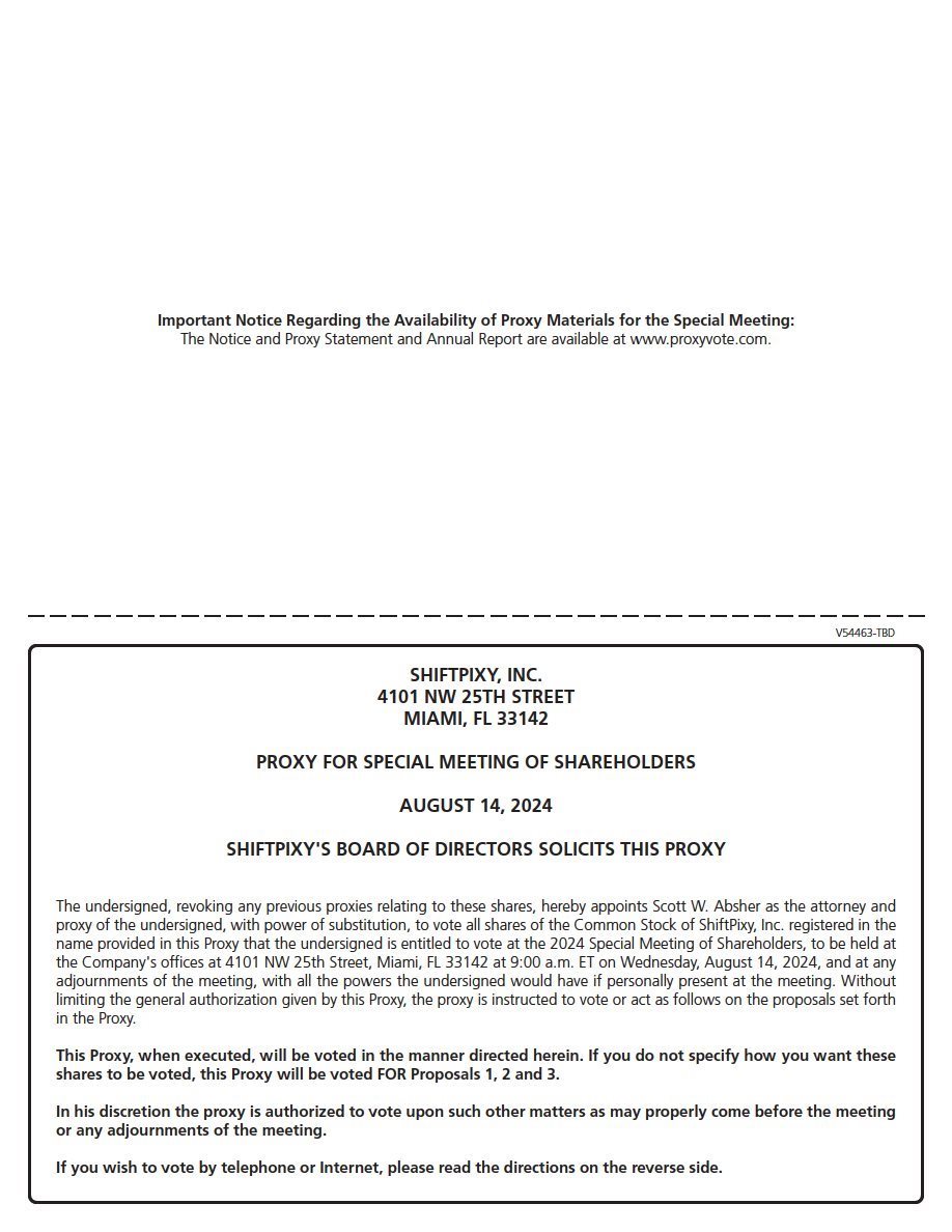 NOTICE IS HEREBY GIVEN that a Special Meeting of Stockholders (the “Special Meeting”) of ShiftPixy, Inc. (the “Company,” “we,” “us,” or “our”), will be held on August 14, 2024 at 9:00 A.M. Eastern Time at the Company’s offices at 4101 NW 25th Street, Miami, FL 33142. At the Special Meeting, stockholders will act on the following matters: