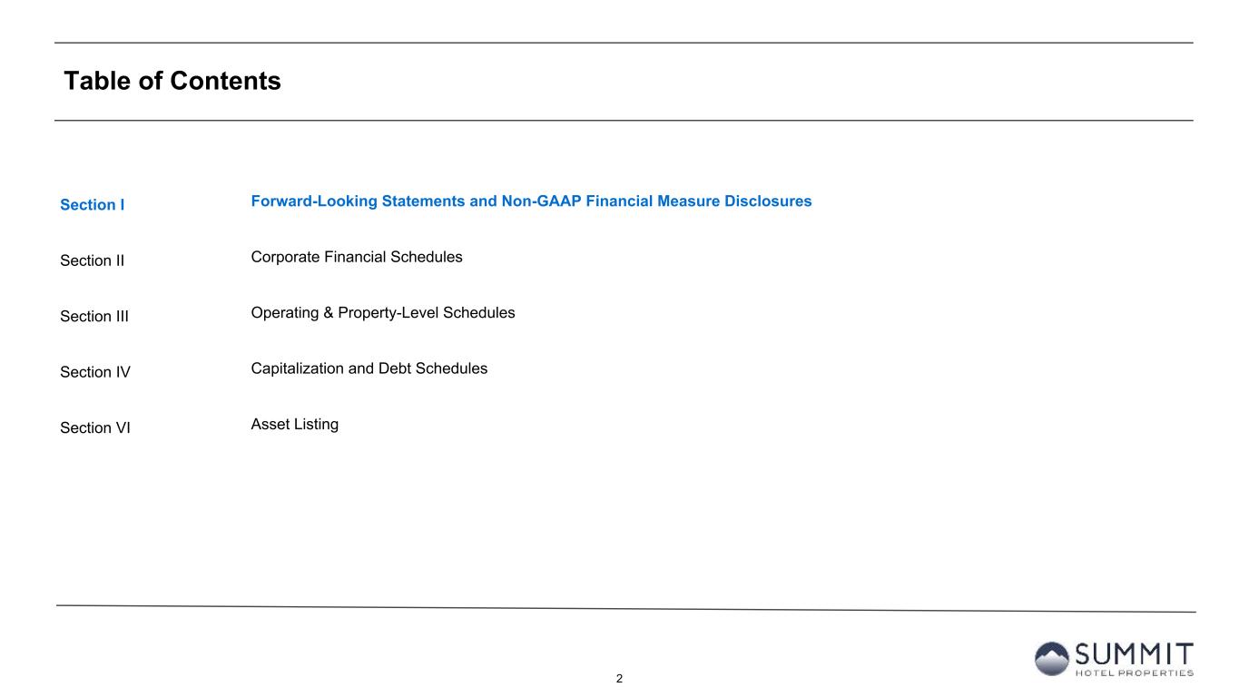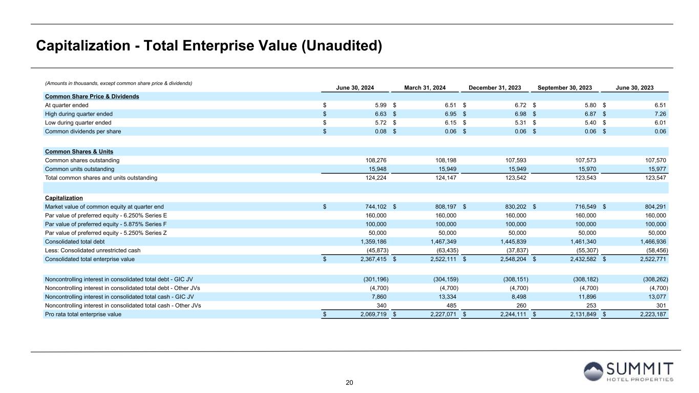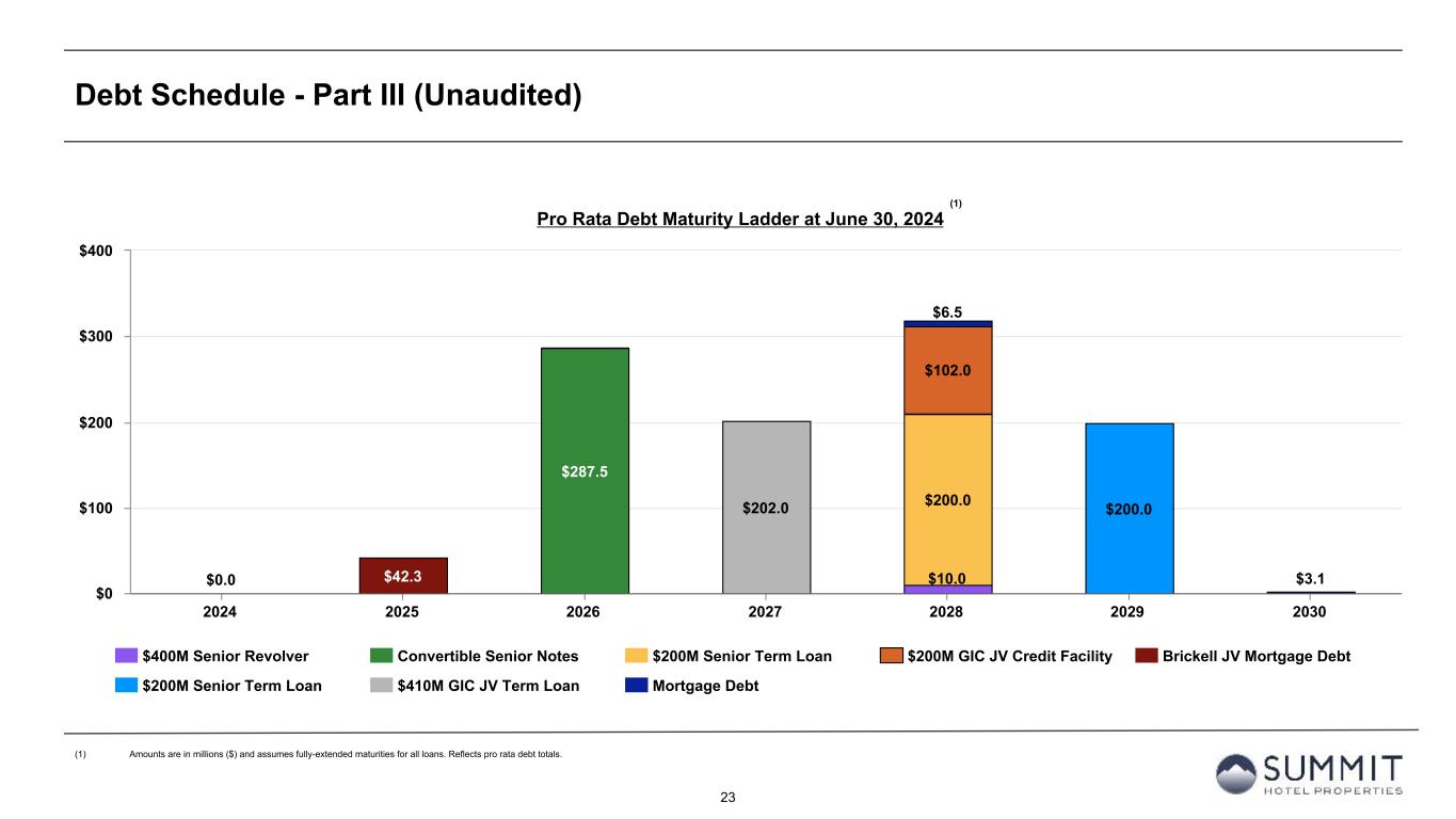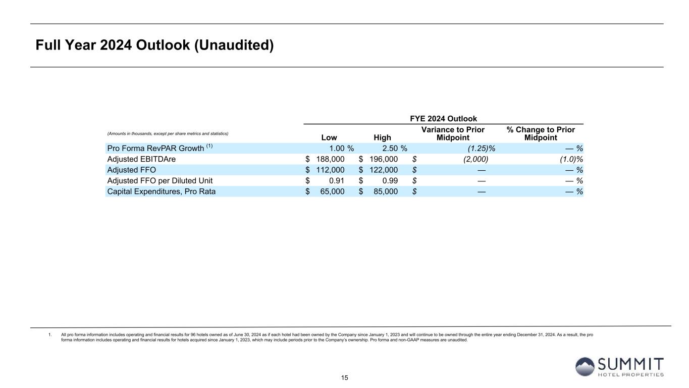 14 Reconciliation to Adjusted FFO - By Ownership Interest (Unaudited) 1. The total of these line items represents depreciation and amortization as reported on the Company’s Condensed Consolidated Statements of Operations for the periods presented. 2. Non-cash interest income relates to the amortization of the discount on certain notes receivable. The discount on these notes receivable was recorded at inception of the related loans based on the estimated value of the embedded purchase options in the notes receivable. 3. The Company includes the outstanding OP units issued by Summit Hotel OP, LP, the Company’s operating partnership, held by limited partners other than the Company because the OP units are redeemable for cash or, at the Company’s option, shares of the Company’s common stock on a one-for-one basis. 4. GIC Joint Venture is 51% owned by Summit while Other Joint Ventures are 90% owned by Summit. Summit GIC Other GIC JV Other JVs YTD 2024 Wholly-Owned Joint Venture Joint Ventures Combined Pro Rata Adj Pro Rata Adj Pro Rata (Amounts in thousands, except statistics) YTD 2024 YTD 2023 YTD 2024 YTD 2023 YTD 2024 YTD 2023 YTD 2024 YTD 2023 YTD 2024 YTD 2023 YTD 2024 YTD 2023 YTD 2024 YTD 2023 Net income (loss) 41,764 5,657 (1,930) (8,058) 1,697 1,321 41,531 (1,080) 907 3,783 (170) (132) 42,268 2,571 Preferred dividends (7,938) (7,938) — — — — (7,938) (7,938) — — — — (7,938) (7,938) Distributions to and accretion of redeemable non- controlling interests (1,314) (1,314) — — — — (1,314) (1,314) — — — — (1,314) (1,314) Net income (loss) applicable to common shares and common units $ 32,512 $ (3,595) $ (1,930) $ (8,058) $ 1,697 $ 1,321 $ 32,279 $ (10,332) $ 907 $ 3,783 $ (170) $ (132) $ 33,016 $ (6,681) Real estate-related depreciation 38,334 38,209 30,396 31,841 2,139 2,004 70,869 72,054 (14,894) (15,602) (214) (200) 55,761 56,252 (Gain) loss on disposal of assets and other dispositions, net (28,290) 336 (127) 32 — — (28,417) 368 62 (16) — — (28,355) 352 FFO applicable to common shares and common units $ 42,556 $ 34,950 $ 28,339 $ 23,815 $ 3,836 $ 3,325 $ 74,731 $ 62,090 $ (13,925) $ (11,835) $ (384) $ (332) $ 60,422 $ 49,923 Recoveries of credit losses — (250) — — — — — (250) — — — — — (250) Equity Based Compensation 4,483 4,046 — — — — 4,483 4,046 — — — — 4,483 4,046 Amortization of Deferred Financing Costs 2,320 1,817 890 938 30 30 3,240 2,785 (436) (460) (3) (3) 2,801 2,322 Amortization of Franchise Fees 168 129 157 157 — — 325 286 (77) (77) — — 248 209 Amortization of intangible assets — — 1,822 1,822 — — 1,822 1,822 (893) (893) — — 929 929 Transaction costs and other — 13 — 11 — — — 24 — (5) — — — 19 Debt Transaction Costs 567 269 14 59 — — 581 328 (7) (29) — — 574 299 Gain on extinguishment of debt (3,000) — — — — — (3,000) — — — — — (3,000) — Non-Cash Interest Income (266) (263) — — — — (266) (263) — — — — (266) (263) Non-Cash Lease expense, net 244 238 (22) 24 — — 222 262 11 (12) — — 233 250 Casualty losses (gains), net 386 820 (863) 556 (404) 95 (881) 1,471 423 (272) 40 (10) (418) 1,189 Non-Cash Items and Other 362 705 (3) 63 — — 359 768 1 (30) — — 360 738 AFFO applicable to common shares and common units (1) $ 47,820 $ 42,474 $ 30,334 $ 27,445 $ 3,462 $ 3,450 $ 81,616 $ 73,369 $ (14,903) $ (13,613) $ (347) $ (345) $ 66,366 $ 59,411 FFO per share of Common Stock and Common Units $ 0.49 $ 0.41 AFFO per share of Common Stock and Common Units $ 0.54 $ 0.49 Weighted-average diluted shares of Common Stock and Common Units 123,664 122,223