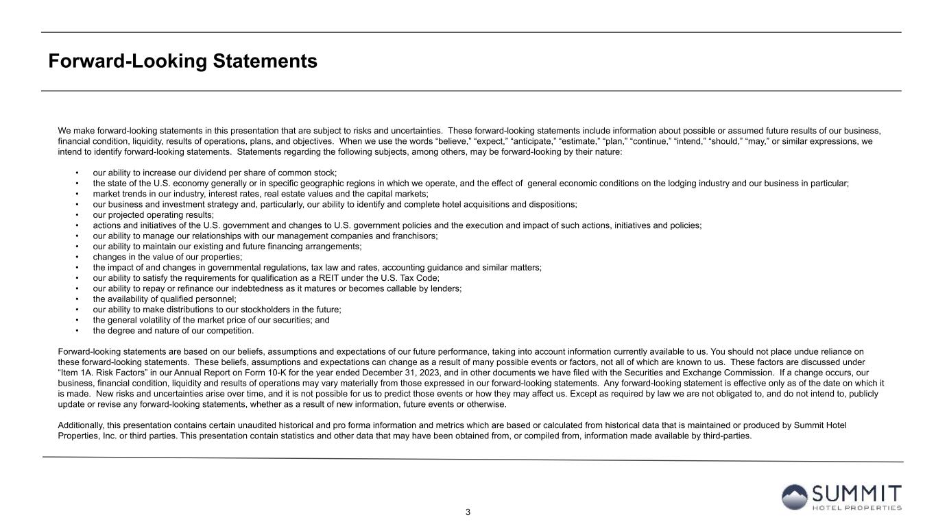 3 Forward-Looking Statements We make forward-looking statements in this presentation that are subject to risks and uncertainties. These forward-looking statements include information about possible or assumed future results of our business, financial condition, liquidity, results of operations, plans, and objectives. When we use the words “believe,” “expect,” “anticipate,” “estimate,” “plan,” “continue,” “intend,” “should,” “may,” or similar expressions, we intend to identify forward-looking statements. Statements regarding the following subjects, among others, may be forward-looking by their nature: • our ability to increase our dividend per share of common stock; • the state of the U.S. economy generally or in specific geographic regions in which we operate, and the effect of general economic conditions on the lodging industry and our business in particular; • market trends in our industry, interest rates, real estate values and the capital markets; • our business and investment strategy and, particularly, our ability to identify and complete hotel acquisitions and dispositions; • our projected operating results; • actions and initiatives of the U.S. government and changes to U.S. government policies and the execution and impact of such actions, initiatives and policies; • our ability to manage our relationships with our management companies and franchisors; • our ability to maintain our existing and future financing arrangements; • changes in the value of our properties; • the impact of and changes in governmental regulations, tax law and rates, accounting guidance and similar matters; • our ability to satisfy the requirements for qualification as a REIT under the U.S. Tax Code; • our ability to repay or refinance our indebtedness as it matures or becomes callable by lenders; • the availability of qualified personnel; • our ability to make distributions to our stockholders in the future; • the general volatility of the market price of our securities; and • the degree and nature of our competition. Forward-looking statements are based on our beliefs, assumptions and expectations of our future performance, taking into account information currently available to us. You should not place undue reliance on these forward-looking statements. These beliefs, assumptions and expectations can change as a result of many possible events or factors, not all of which are known to us. These factors are discussed under “Item 1A. Risk Factors” in our Annual Report on Form 10-K for the year ended December 31, 2023, and in other documents we have filed with the Securities and Exchange Commission. If a change occurs, our business, financial condition, liquidity and results of operations may vary materially from those expressed in our forward-looking statements. Any forward-looking statement is effective only as of the date on which it is made. New risks and uncertainties arise over time, and it is not possible for us to predict those events or how they may affect us. Except as required by law we are not obligated to, and do not intend to, publicly update or revise any forward-looking statements, whether as a result of new information, future events or otherwise. Additionally, this presentation contains certain unaudited historical and pro forma information and metrics which are based or calculated from historical data that is maintained or produced by Summit Hotel Properties, Inc. or third parties. This presentation contain statistics and other data that may have been obtained from, or compiled from, information made available by third-parties.