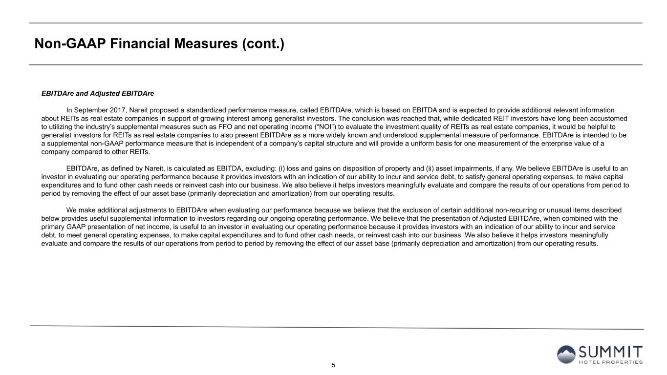 4 Non-GAAP Financial Measures We disclose certain “non-GAAP financial measures,” which are measures of our historical financial performance. Non-GAAP financial measures are financial measures not prescribed by Generally Accepted Accounting Principles ("GAAP"). These measures are as follows: (i) Funds From Operations (“FFO”) and Adjusted Funds from Operations ("AFFO"), (ii) Earnings before Interest, Taxes, Depreciation and Amortization ("EBITDA"), Earnings before Interest, Taxes, Depreciation and Amortization for Real Estate ("EBITDAre") and Adjusted EBITDAre (as described below). We caution investors that amounts presented in accordance with our definitions of non-GAAP financial measures may not be comparable to similar measures disclosed by other companies, since not all companies calculate these non-GAAP financial measures in the same manner. Our non-GAAP financial measures should be considered along with, but not as alternatives to, net income (loss) as a measure of our operating performance. Our non-GAAP financial measures may include funds that may not be available for our discretionary use due to functional requirements to conserve funds for capital expenditures, property acquisitions, debt service obligations and other commitments and uncertainties. Although we believe that our non- GAAP financial measures can enhance the understanding of our financial condition and results of operations, these non-GAAP financial measures are not necessarily better indicators of any trend as compared to a comparable measure prescribed by GAAP such as net income (loss). FFO and AFFO As defined by Nareit, FFO represents net income or loss (computed in accordance with GAAP), excluding preferred dividends, gains (or losses) from sales of real property, impairment losses on real estate assets, items classified by GAAP as extraordinary, the cumulative effect of changes in accounting principles, plus depreciation and amortization related to real estate assets, and adjustments for unconsolidated partnerships, and joint ventures. AFFO represents FFO excluding amortization of deferred financing costs, franchise fees, equity-based compensation expense, transaction costs, debt transaction costs, premiums on redemption of preferred shares, losses from net casualties, non-cash interest income and non-cash income tax related adjustments to our deferred tax asset. Unless otherwise indicated, we present FFO and AFFO applicable to our common shares and common units. We present FFO and AFFO because we consider FFO and AFFO an important supplemental measure of our operational performance and believe it is frequently used by securities analysts, investors and other interested parties in the evaluation of REITs, many of which present FFO and AFFO when reporting their results. FFO and AFFO are intended to exclude GAAP historical cost depreciation and amortization, which assumes that the value of real estate assets diminishes ratably over time. Historically, however, real estate values have risen or fallen with market conditions. Because FFO and AFFO exclude depreciation and amortization related to real estate assets, gains and losses from real property dispositions and impairment losses on real estate assets, and certain transaction costs related to lodging property acquisition activities and debt, FFO and AFFO provide performance measures that, when compared year over year, reflect the effect to operations from trends in occupancy, guestroom rates, operating costs, development activities and interest costs, providing perspective not immediately apparent from net income. Our computation of FFO differs slightly from the computation of Nareit-defined FFO related to the reporting of depreciation and amortization expense on assets at our corporate offices, which is de minimus. Our computation of FFO may also differ from the methodology for calculating FFO used by other equity REITs and, accordingly, may not be comparable to such other REITs. FFO and AFFO should not be considered as an alternative to net income (loss) (computed in accordance with GAAP) as an indicator of our liquidity, nor is it indicative of funds available to fund our cash needs, including our ability to pay dividends or make distributions. Where indicated in this Earnings Release Supplement, FFO is based on our computation of FFO and not the computation of Nareit- defined FFO unless otherwise noted.