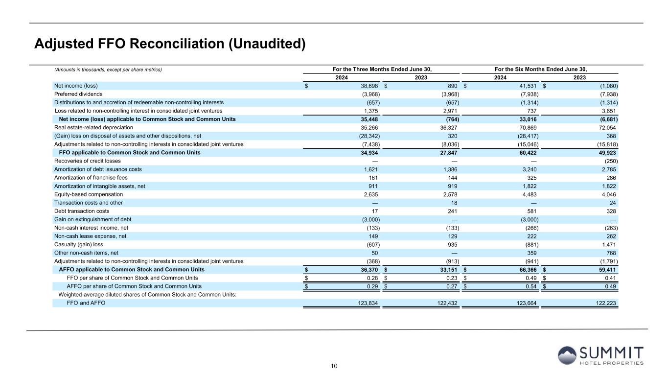 9 Adjusted EBITDAre Reconciliation (Unaudited) (Amounts in thousands) For the Three Months Ended June 30, For the Six Months Ended June 30, 2024 2023 2024 2023 Net income (loss) $ 38,698 $ 890 $ 41,531 $ (1,080) Depreciation and amortization 36,458 37,510 73,257 74,418 Interest expense 20,830 22,248 42,412 43,157 Interest income on cash deposits (264) (157) (421) (240) Income tax expense 2,375 791 2,592 319 EBITDA 98,097 61,282 159,371 116,574 (Gain) loss on disposal of assets and other dispositions, net (28,342) 320 (28,417) 368 EBITDAre 69,755 61,602 130,954 116,942 Recoveries of credit losses — — — (250) Amortization of key money liabilities (121) (121) (242) (257) Equity-based compensation 2,635 2,578 4,483 4,046 Transaction costs and other — 18 — 24 Debt transaction costs 17 241 581 328 Gain on extinguishment of debt (3,000) — (3,000) — Non-cash interest income, net (133) (133) (266) (263) Non-cash lease expense, net 149 129 222 262 Casualty (gain) loss (607) 935 (881) 1,471 Loss related to non-controlling interest in consolidated joint ventures 1,375 2,971 737 3,651 Other non-cash items, net 50 — 362 705 Adjustments related to non-controlling interests in consolidated joint ventures (14,200) (15,324) (28,229) (29,336) Adjusted EBITDAre $ 55,920 $ 52,896 $ 104,721 $ 97,323