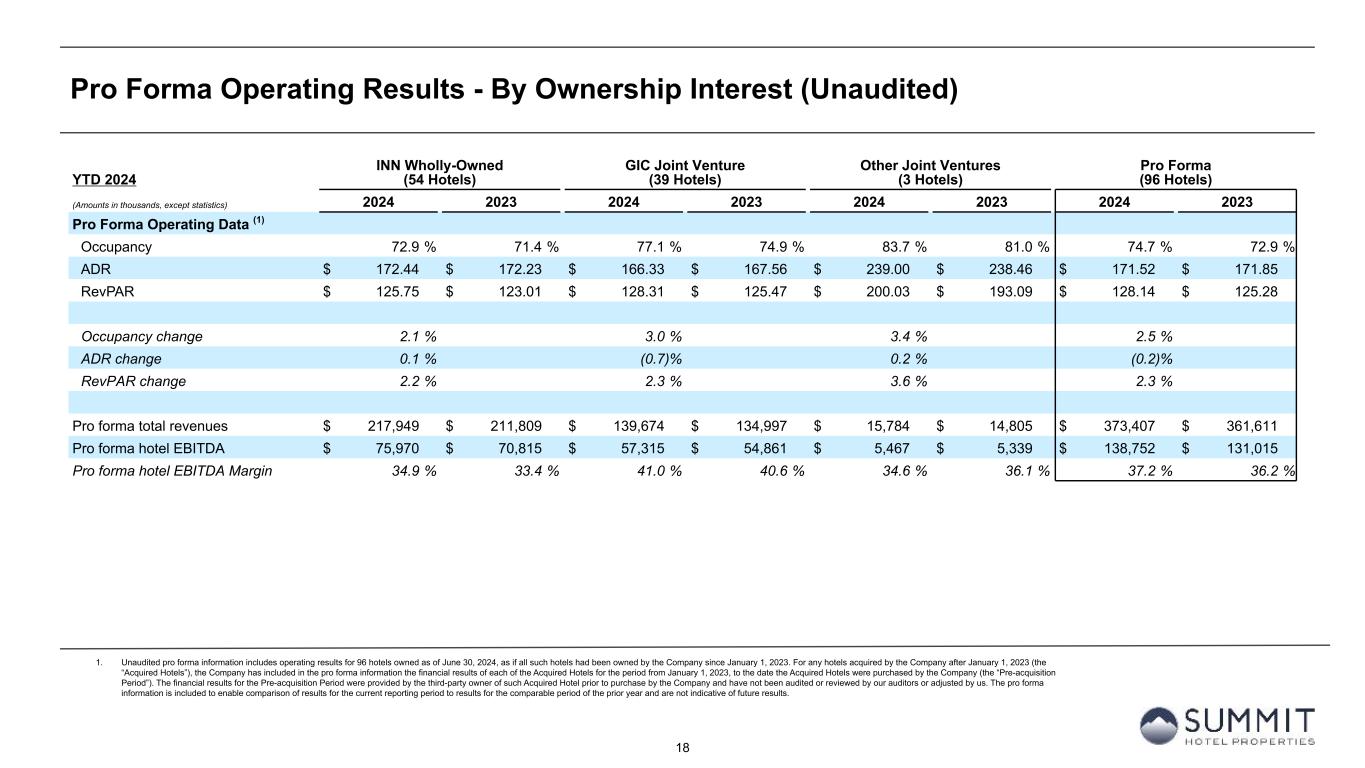 17 Pro Forma Operating Results - By Ownership Interest (Unaudited) 1. Unaudited pro forma information includes operating results for 96 hotels owned as of June 30, 2024, as if all such hotels had been owned by the Company since January 1, 2023. For any hotels acquired by the Company after January 1, 2023 (the “Acquired Hotels”), the Company has included in the pro forma information the financial results of each of the Acquired Hotels for the period from January 1, 2023, to the date the Acquired Hotels were purchased by the Company (the “Pre-acquisition Period”). The financial results for the Pre-acquisition Period were provided by the third-party owner of such Acquired Hotel prior to purchase by the Company and have not been audited or reviewed by our auditors or adjusted by us. The pro forma information is included to enable comparison of results for the current reporting period to results for the comparable period of the prior year and are not indicative of future results. Q2 2024 INN Wholly-Owned (54 Hotels) GIC Joint Venture (39 Hotels) Other Joint Ventures (3 Hotels) Pro Forma (96 Hotels) (Amounts in thousands, except statistics) 2024 2023 2024 2023 2024 2023 2024 2023 Pro Forma Operating Data (1) Occupancy 77.2 % 75.3 % 78.2 % 76.8 % 81.3 % 75.9 % 77.7 % 75.8 % ADR $ 176.43 $ 174.59 $ 159.45 $ 157.79 $ 198.01 $ 208.83 $ 170.46 $ 168.89 RevPAR $ 136.22 $ 131.41 $ 124.76 $ 121.16 $ 161.08 $ 158.41 $ 132.41 $ 128.10 Occupancy change 2.6 % 1.9 % 7.2 % 2.4 % ADR change 1.0 % 1.0 % (5.2) % 0.9 % RevPAR change 3.7 % 3.0 % 1.7 % 3.4 % Pro forma total revenues $ 117,749 $ 113,577 $ 67,964 $ 65,769 $ 6,802 $ 6,444 $ 192,515 $ 185,789 Pro forma hotel EBITDA $ 44,276 $ 40,696 $ 26,919 $ 25,686 $ 1,900 $ 1,921 $ 73,094 $ 68,303 Pro forma hotel EBITDA Margin 37.6 % 35.8 % 39.6 % 39.1 % 27.9 % 29.8 % 38.0 % 36.8 %
