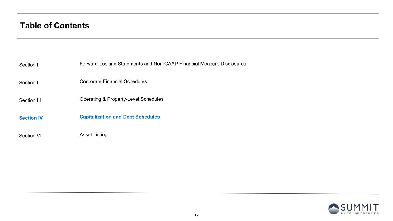 19 Table of Contents Section I Section II Section III Section IV Section VI Forward-Looking Statements and Non-GAAP Financial Measure Disclosures Corporate Financial Schedules Operating & Property-Level Schedules Capitalization and Debt Schedules Asset Listing