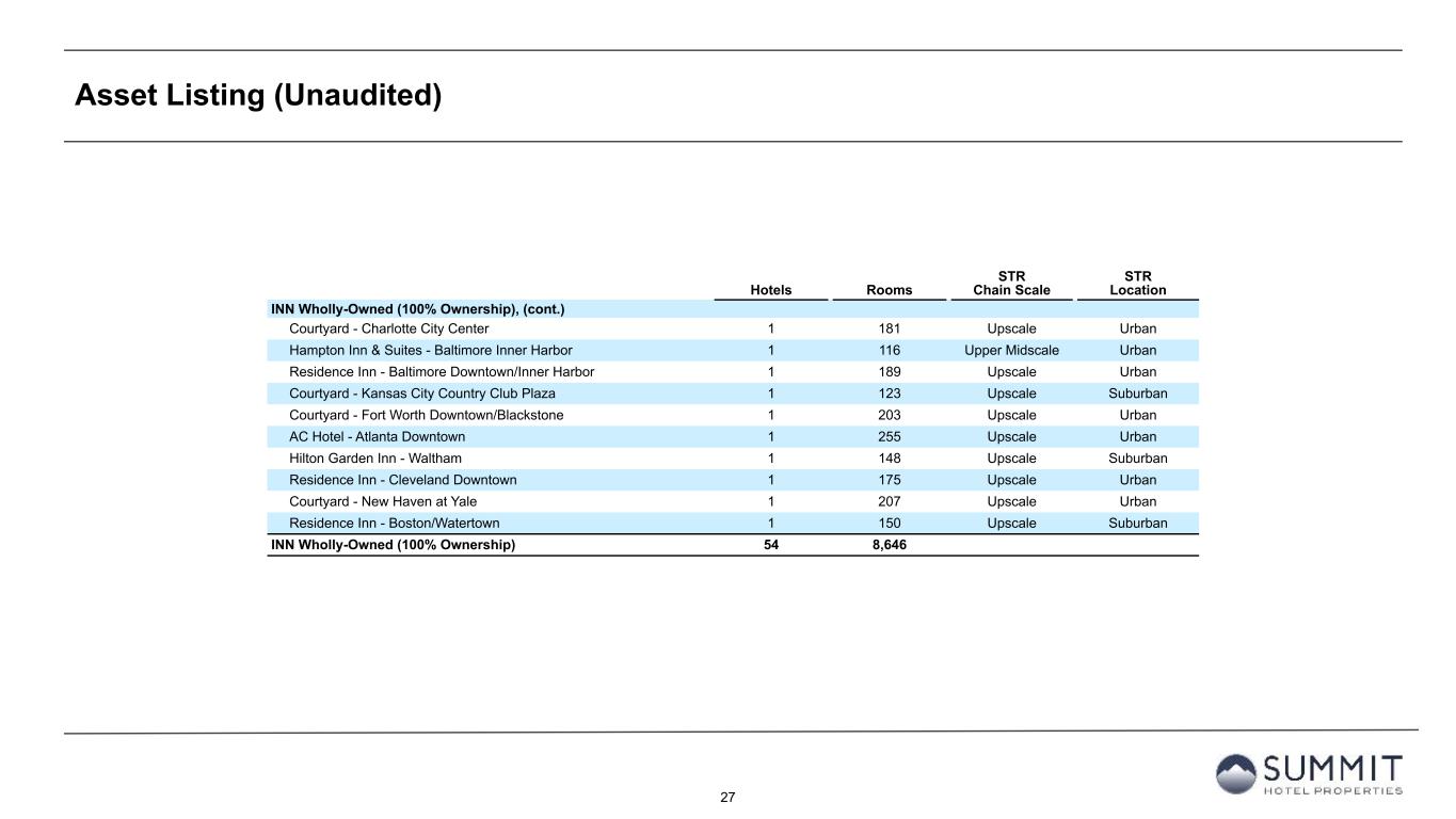 26 Asset Listing (Unaudited) Hotels Rooms STR Chain Scale STR Location INN Wholly-Owned (100% Ownership), (cont.) SpringHill Suites - Louisville Downtown 1 198 Upscale Urban SpringHill Suites - Indianapolis Downtown 1 156 Upscale Urban Courtyard - Indianapolis Downtown 1 297 Upscale Urban Hampton Inn & Suites - San Diego/Poway 1 108 Upper Midscale Suburban Hampton Inn & Suites - Camarillo 1 116 Upper Midscale Suburban Hilton Garden Inn - Houston/Galleria Area 1 182 Upscale Urban Doubletree by Hilton San Francisco Airport North Bayfront 1 210 Upscale Airport Four Points - San Francisco Airport 1 101 Upscale Airport Hilton Garden Inn - Houston/Energy Corridor 1 190 Upscale Suburban Hampton Inn & Suites - Austin/Downtown/Convention Center 1 209 Upper Midscale Urban Hampton Inn & Suites - Minneapolis/Downtown 1 211 Upper Midscale Urban Residence Inn - Bridgewater/Branchburg 1 101 Upscale Suburban Hyatt House - Across From Universal Orlando Resort 1 168 Upscale Resort Residence Inn - Baltimore/Hunt Valley 1 141 Upscale Suburban Hotel Indigo - Asheville Downtown 1 116 Upper Upscale Small Metro/Town Courtyard - Atlanta Decatur Downtown/Emory 1 179 Upscale Suburban Courtyard - Nashville Vanderbilt/West End 1 226 Upscale Urban Residence Inn - Atlanta Midtown/Peachtree at 17th 1 160 Upscale Urban Hyatt House - Miami Airport 1 163 Upscale Airport Marriott - Boulder 1 165 Upper Upscale Urban Hyatt Place - Chicago/Downtown-The Loop 1 206 Upscale Urban Hyatt Place - Phoenix/Mesa 1 152 Upscale Suburban Courtyard - Fort Lauderdale Beach 1 261 Upscale Resort