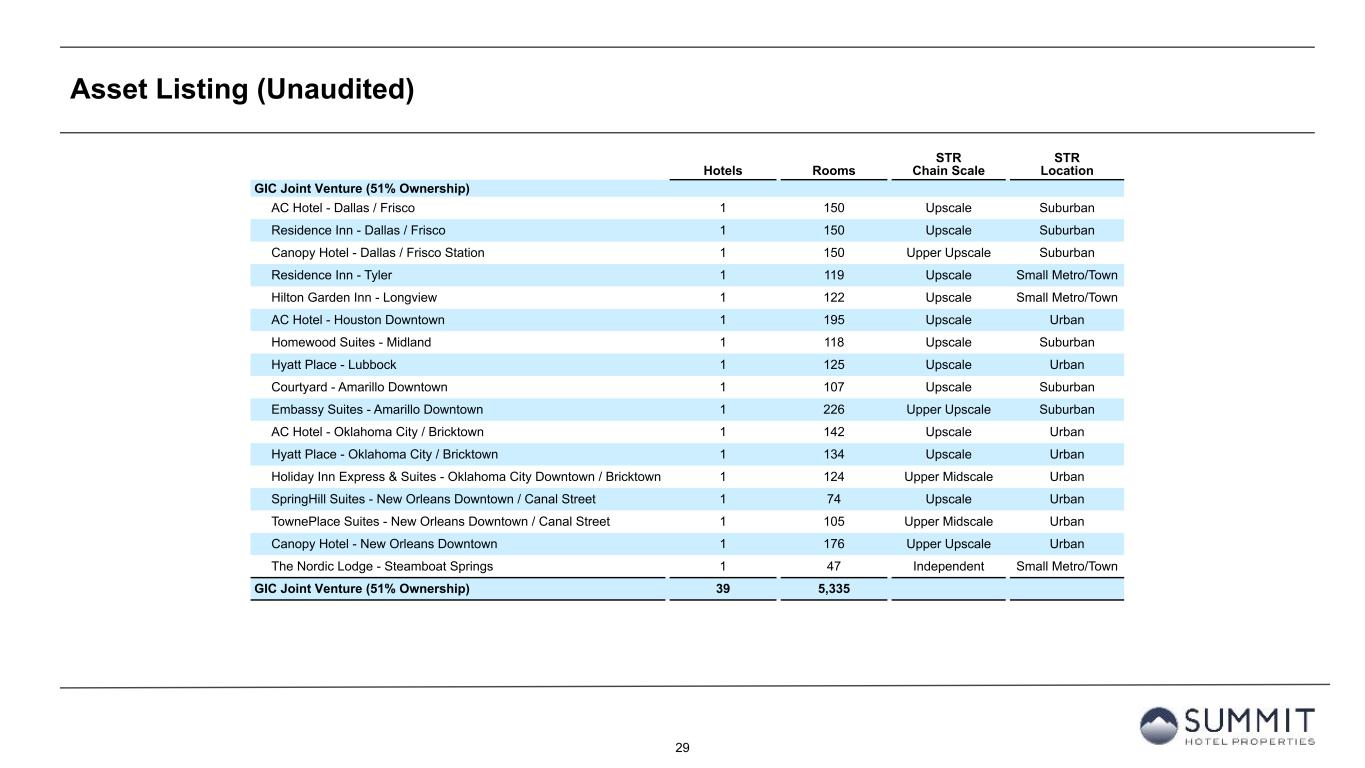 28 Asset Listing (Unaudited) Hotels Rooms STR Chain Scale STR Location GIC Joint Venture (51% Ownership) Courtyard - Scottsdale North 1 153 Upscale Resort Springhill Suites - Scottsdale North 1 121 Upscale Resort Hampton Inn & Suites - Tampa/Ybor City/Downtown 1 138 Upper Midscale Urban Homewood Suites - Aliso Viejo/Laguna Beach 1 129 Upscale Suburban Courtyard - Pittsburgh Downtown 1 183 Upscale Urban Homewood Suites - Tucson/St. Philip's Plaza University 1 122 Upscale Resort Hampton Inn & Suites - Silverthorne 1 88 Upper Midscale Resort Hilton Garden Inn - San Jose / Milpitas 1 161 Upscale Suburban Residence Inn - Portland Downtown / Riverplace 1 258 Upscale Urban Residence Inn - Portland / Hillsboro 1 122 Upscale Suburban Residence Inn - Steamboat Springs 1 110 Upscale Small Metro/Town Embassy Suites - Tucson / Paloma Village 1 120 Upper Upscale Resort Residence Inn - Scottsdale North 1 120 Upscale Resort AC Hotel - Dallas Downtown 1 128 Upscale Urban Residence Inn - Dallas Downtown 1 121 Upscale Urban Hampton Inn & Suites - Dallas Downtown 1 176 Upper Midscale Urban SpringHill Suites - Dallas Downtown 1 148 Upscale Urban Hilton Garden Inn - Grapevine at Silver Lake Crossing 1 152 Upscale Airport Holiday Inn Express & Suites - DFW / Grapevine 1 95 Upper Midscale Airport Courtyard - Dallas DFW Airport / North Grapevine 1 181 Upscale Airport TownePlace Suites - Dallas / Grapevine 1 120 Upper Midscale Airport Hyatt Place - Dallas / Grapevine 1 125 Upscale Airport