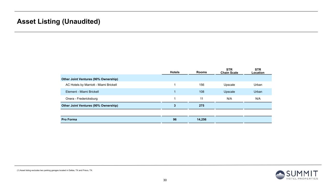 29 Asset Listing (Unaudited) Hotels Rooms STR Chain Scale STR Location GIC Joint Venture (51% Ownership) AC Hotel - Dallas / Frisco 1 150 Upscale Suburban Residence Inn - Dallas / Frisco 1 150 Upscale Suburban Canopy Hotel - Dallas / Frisco Station 1 150 Upper Upscale Suburban Residence Inn - Tyler 1 119 Upscale Small Metro/Town Hilton Garden Inn - Longview 1 122 Upscale Small Metro/Town AC Hotel - Houston Downtown 1 195 Upscale Urban Homewood Suites - Midland 1 118 Upscale Suburban Hyatt Place - Lubbock 1 125 Upscale Urban Courtyard - Amarillo Downtown 1 107 Upscale Suburban Embassy Suites - Amarillo Downtown 1 226 Upper Upscale Suburban AC Hotel - Oklahoma City / Bricktown 1 142 Upscale Urban Hyatt Place - Oklahoma City / Bricktown 1 134 Upscale Urban Holiday Inn Express & Suites - Oklahoma City Downtown / Bricktown 1 124 Upper Midscale Urban SpringHill Suites - New Orleans Downtown / Canal Street 1 74 Upscale Urban TownePlace Suites - New Orleans Downtown / Canal Street 1 105 Upper Midscale Urban Canopy Hotel - New Orleans Downtown 1 176 Upper Upscale Urban The Nordic Lodge - Steamboat Springs 1 47 Independent Small Metro/Town GIC Joint Venture (51% Ownership) 39 5,335
