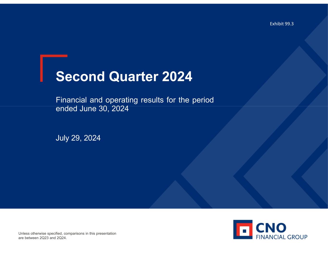Carmel, Ind., July 29, 2024 - CNO Financial Group, Inc. (NYSE: CNO) today reported net income of $116.3 million, or $1.06 per diluted share, in 2Q24 compared to $73.7 million, or $0.64 per diluted share, in 2Q23. Net operating income (1) was $114.6 million, or $1.05 per diluted share, in 2Q24 compared to $62.3 million, or $0.54 per diluted share, in 2Q23.