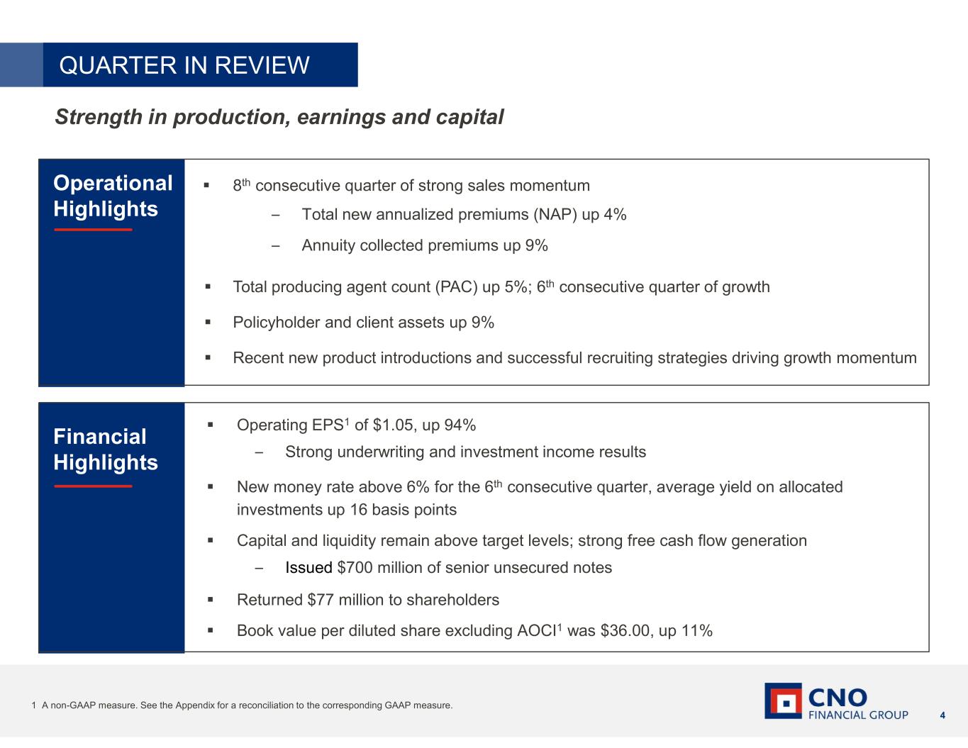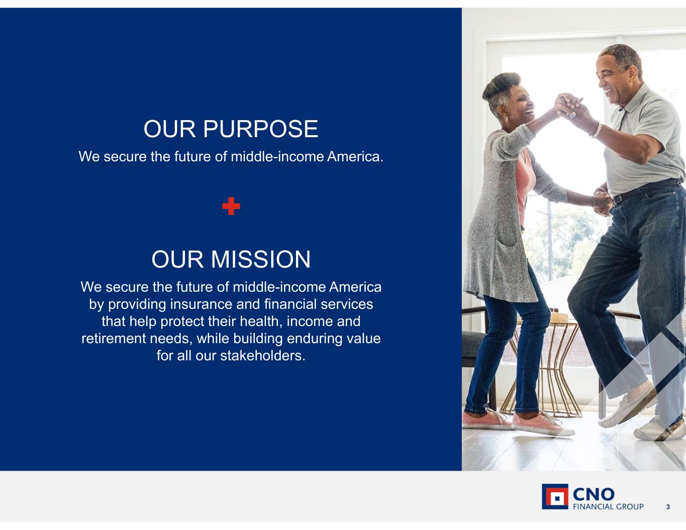2 Certain statements made in this presentation should be considered forward-looking statements as defined in the Private Securities Litigation Reform Act of 1995. These include statements about future results of operations and capital plans. We caution investors that these forward-looking statements are not guarantees of future performance, and actual results may differ materially. Investors should consider the important risks and uncertainties that may cause actual results to differ, including those included in our press release issued on July 29, 2024, our Quarterly Reports on Form 10-Q, our Annual Report on Form 10-K and other filings we make with the Securities and Exchange Commission. We assume no obligation to update this presentation, which speaks as of today’s date. Forward-Looking Statements This presentation contains financial measures that differ from the comparable measures under Generally Accepted Accounting Principles (GAAP). Reconciliations between those non-GAAP measures and the comparable GAAP measures are included in the Appendix, or on the page such measure is presented. While management believes the measures are useful to enhance understanding and comparability of our financial results, these non-GAAP measures should not be considered substitutes for the most directly comparable GAAP measures. Additional information concerning non-GAAP measures is included in our periodic filings with the Securities and Exchange Commission that are available in the “Investors – Financials – SEC Filings” section of CNO’s website, CNOinc.com. Non-GAAP Measures IMPORTANT LEGAL INFORMATION
