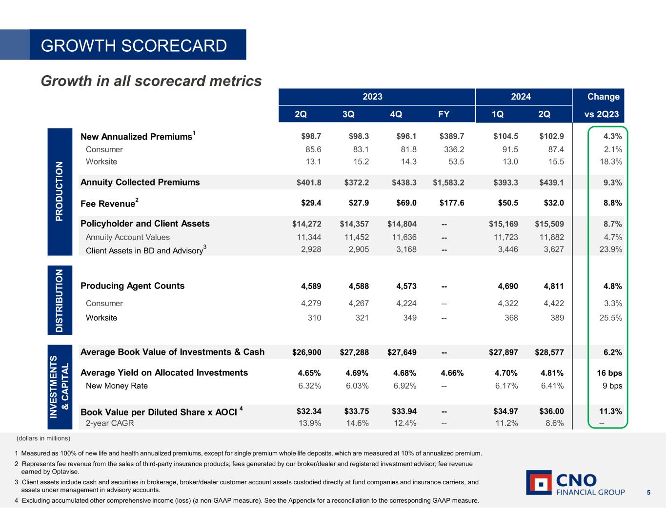 5 1 Measured as 100% of new life and health annualized premiums, except for single premium whole life deposits, which are measured at 10% of annualized premium. 2 Represents fee revenue from the sales of third-party insurance products; fees generated by our broker/dealer and registered investment advisor; fee revenue earned by Optavise. 3 Client assets include cash and securities in brokerage, broker/dealer customer account assets custodied directly at fund companies and insurance carriers, and assets under management in advisory accounts. 4 Excluding accumulated other comprehensive income (loss) (a non-GAAP measure). See the Appendix for a reconciliation to the corresponding GAAP measure. GROWTH SCORECARD Growth in all scorecard metrics (dollars in millions) 2Q 3Q 4Q FY 1Q 2Q vs 2Q23 New Annualized Premiums1 $98.7 $98.3 $96.1 $389.7 $104.5 $102.9 4.3% Consumer 85.6 83.1 81.8 336.2 91.5 87.4 2.1% Worksite 13.1 15.2 14.3 53.5 13.0 15.5 18.3% Annuity Collected Premiums $401.8 $372.2 $438.3 $1,583.2 $393.3 $439.1 9.3% Fee Revenue2 $29.4 $27.9 $69.0 $177.6 $50.5 $32.0 8.8% Policyholder and Client Assets $14,272 $14,357 $14,804 -- $15,169 $15,509 8.7% Annuity Account Values 11,344 11,452 11,636 -- 11,723 11,882 4.7% Client Assets in BD and Advisory 3 2,928 2,905 3,168 -- 3,446 3,627 23.9% Producing Agent Counts 4,589 4,588 4,573 -- 4,690 4,811 4.8% Consumer 4,279 4,267 4,224 -- 4,322 4,422 3.3% Worksite 310 321 349 -- 368 389 25.5% Average Book Value of Investments & Cash $26,900 $27,288 $27,649 -- $27,897 $28,577 6.2% Average Yield on Allocated Investments 4.65% 4.69% 4.68% 4.66% 4.70% 4.81% 16 bps New Money Rate 6.32% 6.03% 6.92% -- 6.17% 6.41% 9 bps Book Value per Diluted Share x AOCI 4 $32.34 $33.75 $33.94 -- $34.97 $36.00 11.3% 2-year CAGR 13.9% 14.6% 12.4% -- 11.2% 8.6% -- IN V E S T M E N T S & C A P IT A L Change2023 P R O D U C T IO N D IS T R IB U T IO N 2024