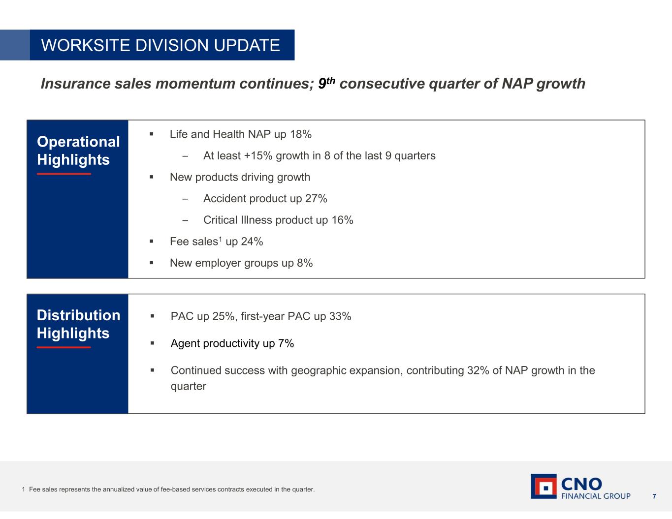 6 CONSUMER DIVISION UPDATE Successful execution delivering consistent and sustainable sales growth; 7th consecutive quarter of sales growth PAC up 3%, 6th consecutive quarter of growth – Recruiting up 1%, 8th consecutive quarter of growth Agent productivity and retention remain strong Continued disciplined and opportunistic approach to D2C advertising spend NAP generated from web/digital channels up 4%, now represents ~28% of total D2C Life and Health NAP up 2%, field agent NAP up 8% Health NAP up 18%; Medicare Supplement NAP up 16%; LTC NAP up 88% Annuity collected premiums up 9%; account value up 5% Medicare Advantage policies sold up 78% Client assets in brokerage and advisory up 24% to a record $3.6B – New accounts up 9% Operational Highlights Distribution Highlights