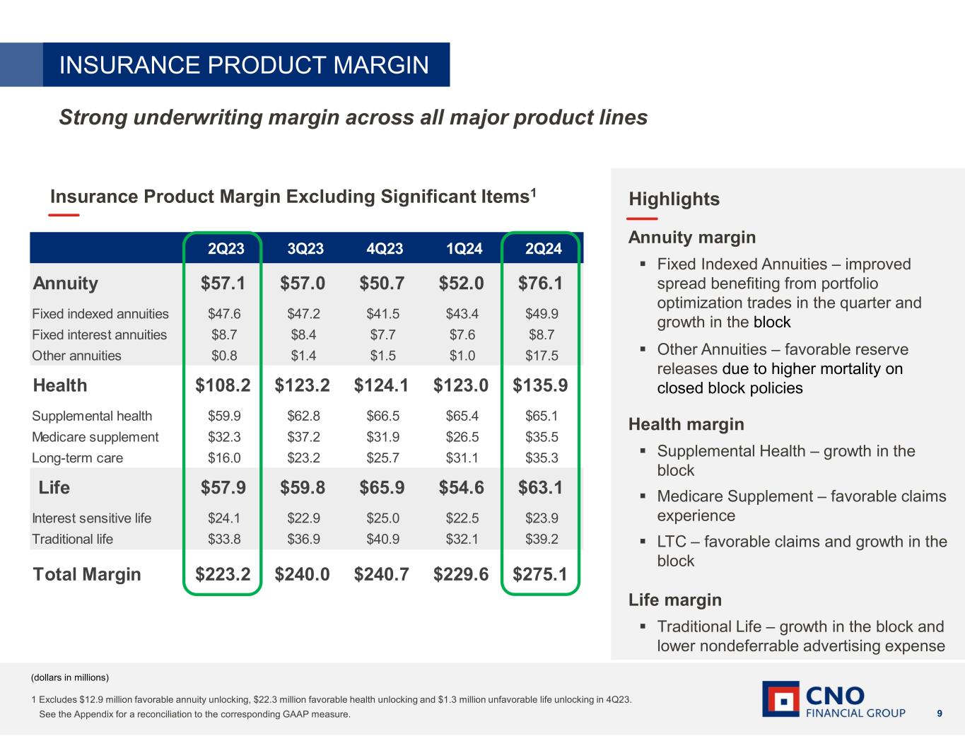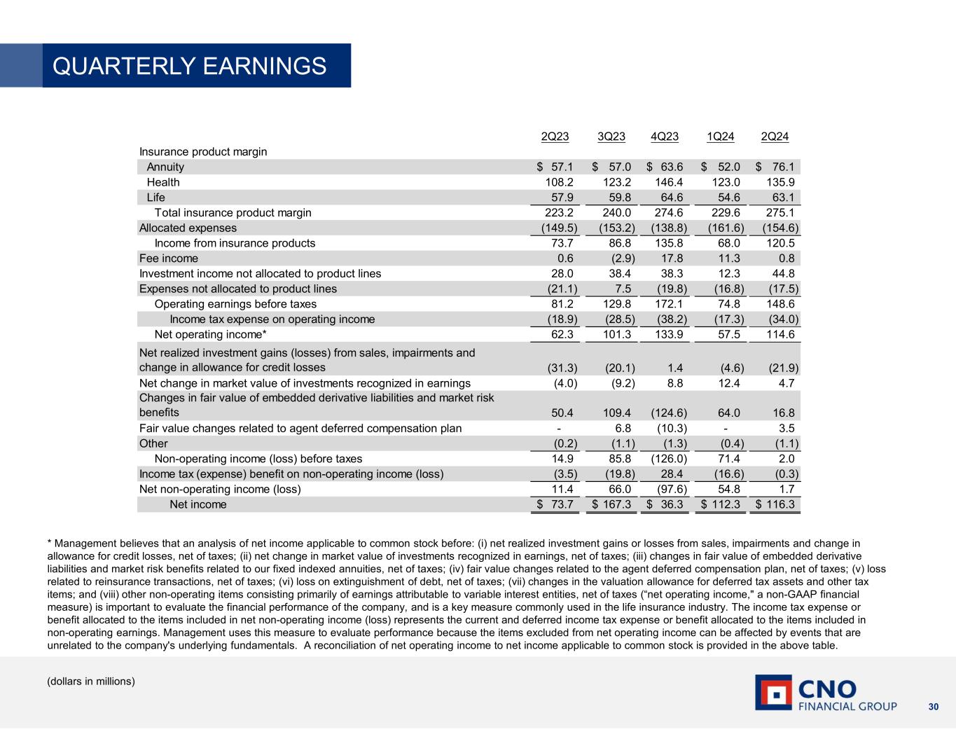 30 (dollars in millions) * Management believes that an analysis of net income applicable to common stock before: (i) net realized investment gains or losses from sales, impairments and change in allowance for credit losses, net of taxes; (ii) net change in market value of investments recognized in earnings, net of taxes; (iii) changes in fair value of embedded derivative liabilities and market risk benefits related to our fixed indexed annuities, net of taxes; (iv) fair value changes related to the agent deferred compensation plan, net of taxes; (v) loss related to reinsurance transactions, net of taxes; (vi) loss on extinguishment of debt, net of taxes; (vii) changes in the valuation allowance for deferred tax assets and other tax items; and (viii) other non-operating items consisting primarily of earnings attributable to variable interest entities, net of taxes (“net operating income," a non-GAAP financial measure) is important to evaluate the financial performance of the company, and is a key measure commonly used in the life insurance industry. The income tax expense or benefit allocated to the items included in net non-operating income (loss) represents the current and deferred income tax expense or benefit allocated to the items included in non-operating earnings. Management uses this measure to evaluate performance because the items excluded from net operating income can be affected by events that are unrelated to the company's underlying fundamentals. A reconciliation of net operating income to net income applicable to common stock is provided in the above table. QUARTERLY EARNINGS 2Q23 3Q23 4Q23 1Q24 2Q24 Insurance product margin Annuity 57.1$ 57.0$ 63.6$ 52.0$ 76.1$ Health 108.2 123.2 146.4 123.0 135.9 Life 57.9 59.8 64.6 54.6 63.1 Total insurance product margin 223.2 240.0 274.6 229.6 275.1 Allocated expenses (149.5) (153.2) (138.8) (161.6) (154.6) Income from insurance products 73.7 86.8 135.8 68.0 120.5 Fee income 0.6 (2.9) 17.8 11.3 0.8 Investment income not allocated to product lines 28.0 38.4 38.3 12.3 44.8 Expenses not allocated to product lines (21.1) 7.5 (19.8) (16.8) (17.5) Operating earnings before taxes 81.2 129.8 172.1 74.8 148.6 Income tax expense on operating income (18.9) (28.5) (38.2) (17.3) (34.0) Net operating income* 62.3 101.3 133.9 57.5 114.6 Net realized investment gains (losses) from sales, impairments and change in allowance for credit losses (31.3) (20.1) 1.4 (4.6) (21.9) Net change in market value of investments recognized in earnings (4.0) (9.2) 8.8 12.4 4.7 Changes in fair value of embedded derivative liabilities and market risk benefits 50.4 109.4 (124.6) 64.0 16.8 Fair value changes related to agent deferred compensation plan - 6.8 (10.3) - 3.5 Other (0.2) (1.1) (1.3) (0.4) (1.1) Non-operating income (loss) before taxes 14.9 85.8 (126.0) 71.4 2.0 Income tax (expense) benefit on non-operating income (loss) (3.5) (19.8) 28.4 (16.6) (0.3) Net non-operating income (loss) 11.4 66.0 (97.6) 54.8 1.7 Net income 73.7$ 167.3$ 36.3$ 112.3$ 116.3$