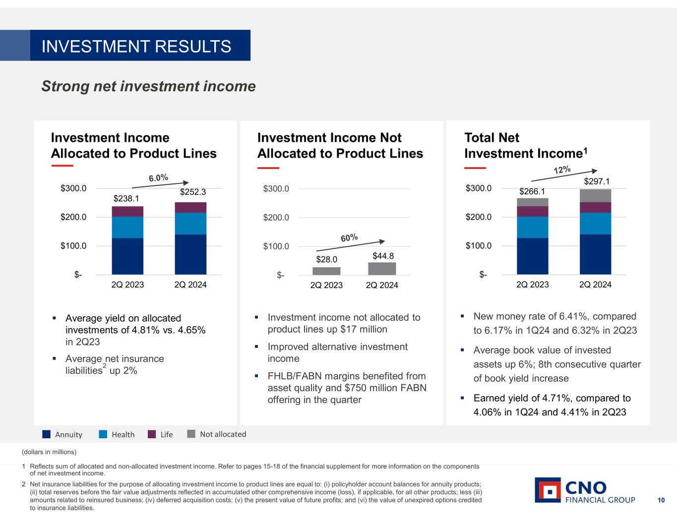 9 (dollars in millions) Insurance Product Margin Excluding Significant Items1 1 Excludes $12.9 million favorable annuity unlocking, $22.3 million favorable health unlocking and $1.3 million unfavorable life unlocking in 4Q23. See the Appendix for a reconciliation to the corresponding GAAP measure. Annuity margin Fixed Indexed Annuities – improved spread benefiting from portfolio optimization trades in the quarter and growth in the block Other Annuities – favorable reserve releases due to higher mortality on closed block policies Health margin Supplemental Health – growth in the block Medicare Supplement – favorable claims experience LTC – favorable claims and growth in the block Life margin Traditional Life – growth in the block and lower nondeferrable advertising expense Highlights INSURANCE PRODUCT MARGIN Strong underwriting margin across all major product lines 2Q23 3Q23 4Q23 1Q24 2Q24 Annuity $57.1 $57.0 $50.7 $52.0 $76.1 Fixed indexed annuities $47.6 $47.2 $41.5 $43.4 $49.9 Fixed interest annuities $8.7 $8.4 $7.7 $7.6 $8.7 Other annuities $0.8 $1.4 $1.5 $1.0 $17.5 Health $108.2 $123.2 $124.1 $123.0 $135.9 Supplemental health $59.9 $62.8 $66.5 $65.4 $65.1 Medicare supplement $32.3 $37.2 $31.9 $26.5 $35.5 Long-term care $16.0 $23.2 $25.7 $31.1 $35.3 Life $57.9 $59.8 $65.9 $54.6 $63.1 Interest sensitive life $24.1 $22.9 $25.0 $22.5 $23.9 Traditional life $33.8 $36.9 $40.9 $32.1 $39.2 Total Margin $223.2 $240.0 $240.7 $229.6 $275.1