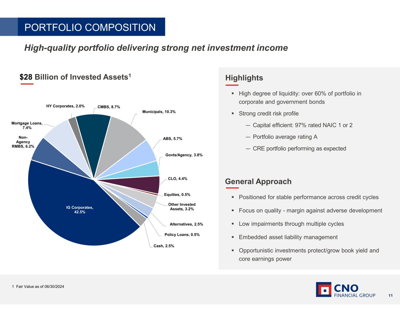 10 1 Reflects sum of allocated and non-allocated investment income. Refer to pages 15-18 of the financial supplement for more information on the components of net investment income. 2 Net insurance liabilities for the purpose of allocating investment income to product lines are equal to: (i) policyholder account balances for annuity products; (ii) total reserves before the fair value adjustments reflected in accumulated other comprehensive income (loss), if applicable, for all other products; less (iii) amounts related to reinsured business; (iv) deferred acquisition costs; (v) the present value of future profits; and (vi) the value of unexpired options credited to insurance liabilities. Average yield on allocated investments of 4.81% vs. 4.65% in 2Q23 Average net insurance liabilities 2 up 2% New money rate of 6.41%, compared to 6.17% in 1Q24 and 6.32% in 2Q23 Average book value of invested assets up 6%; 8th consecutive quarter of book yield increase Earned yield of 4.71%, compared to 4.06% in 1Q24 and 4.41% in 2Q23 Investment income not allocated to product lines up $17 million Improved alternative investment income FHLB/FABN margins benefited from asset quality and $750 million FABN offering in the quarter Investment Income Allocated to Product Lines Investment Income Not Allocated to Product Lines Total Net Investment Income1 Annuity Health Life Not allocated $- $100.0 $200.0 $300.0 2Q 2023 2Q 2024 $252.3 $238.1 $28.0 $44.8 $- $100.0 $200.0 $300.0 2Q 2023 2Q 2024 $- $100.0 $200.0 $300.0 2Q 2023 2Q 2024 $297.1 $266.1 INVESTMENT RESULTS Strong net investment income (dollars in millions)