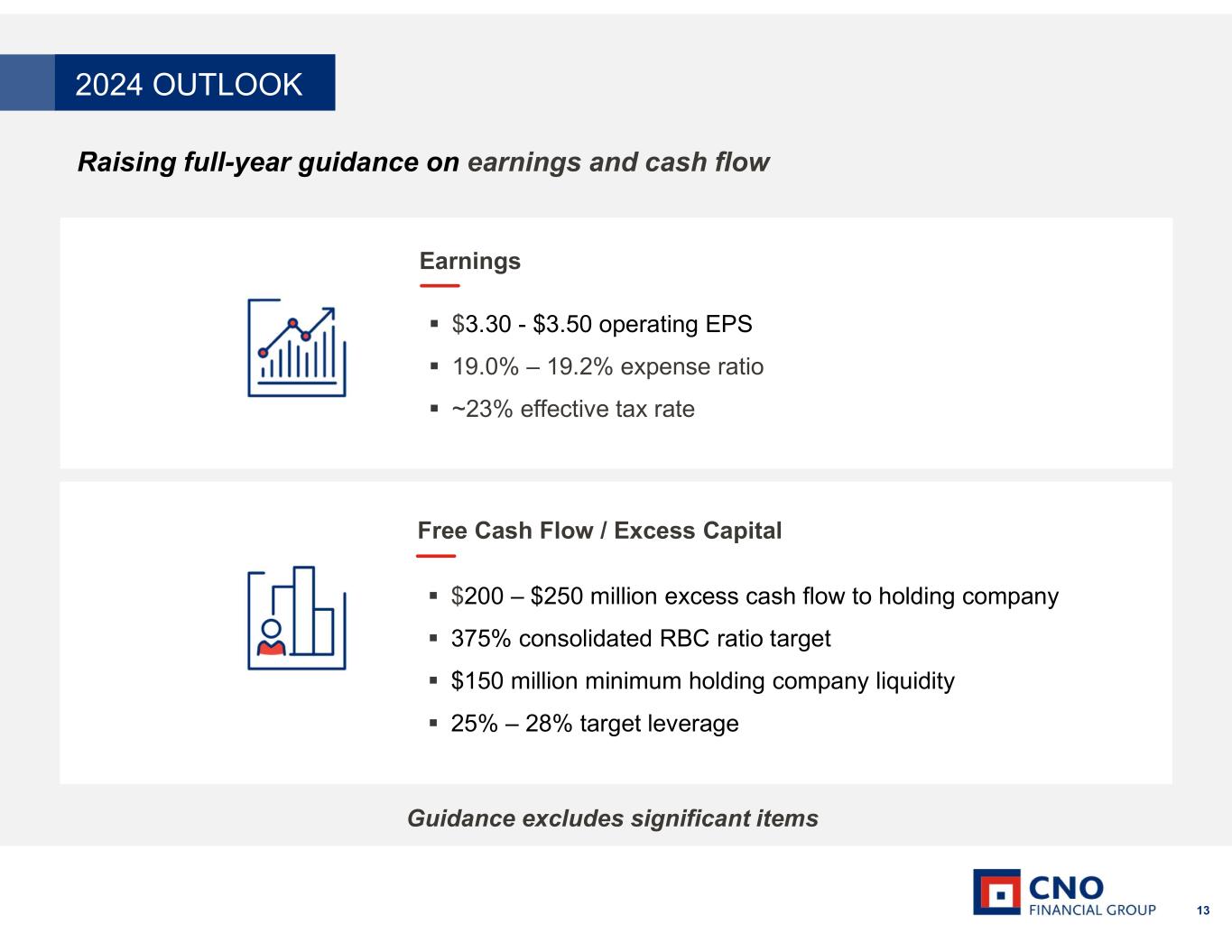 12 Debt to Capital2 Consolidated Risk Based Capital (RBC) Ratio1 Holding Company Liquidity 384% 402% 391% 394% 2022 2023 1Q24 2Q24 $167 $256 $223 $429 2022 2023 1Q24 2Q24 23.4% 23.1% 22.9% 32.0% 2022 2023 1Q24 2Q24 1 The ratio of the combined capital of the insurance companies to the minimum amount of capital appropriate to support the overall business operations, as determined based on the methodology developed by the National Association of Insurance Commissioners. 2 Excluding accumulated other comprehensive income (loss) (a non-GAAP measure). See the Appendix for a reconciliation to the corresponding GAAP measure. (dollars in millions) Target consolidated RBC ratio of approximately 375% RBC variability expected in periods of market volatility Target leverage of 25% - 28% Reported result of 32.0%2 includes $500 million note maturing May 2025, expected to be repaid with proceeds from the recent $700 million debt issuance. Excluding this note, debt to capital is 25.5%2 Debt covenant ceiling of 35% $180 million in debt capacity to top of target leverage range, assuming repayment of 2025 Notes Target minimum holding company liquidity of $150 million Liquidity backstopped by $250 million undrawn revolver Issued $700 million in senior unsecured notes in the quarter, $500 million earmarked for repayment of May 2025 maturity Staggered debt maturities in 2029 and 2034 CAPITAL AND LIQUIDITY OVERVIEW Capital and liquidity remain above target levels 25.5% Debt to capital2 excluding $500 million note maturing May 2025