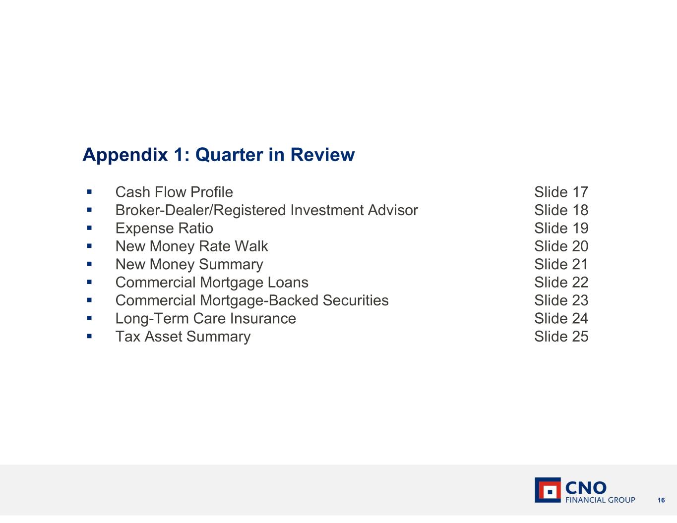 16 Cash Flow Profile Slide 17 Broker-Dealer/Registered Investment Advisor Slide 18 Expense Ratio Slide 19 New Money Rate Walk Slide 20 New Money Summary Slide 21 Commercial Mortgage Loans Slide 22 Commercial Mortgage-Backed Securities Slide 23 Long-Term Care Insurance Slide 24 Tax Asset Summary Slide 25 Appendix 1: Quarter in Review