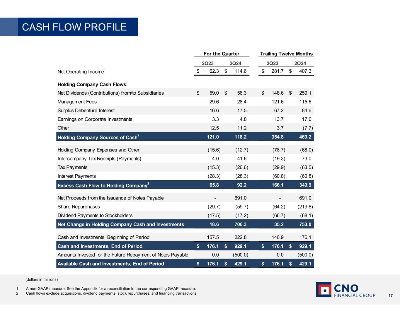 17 1 A non-GAAP measure. See the Appendix for a reconciliation to the corresponding GAAP measure. 2 Cash flows exclude acquisitions, dividend payments, stock repurchases, and financing transactions (dollars in millions) CASH FLOW PROFILE 2Q23 2Q24 2Q23 2Q24 Net Operating Income1 62.3$ 114.6$ 281.7$ 407.3$ Holding Company Cash Flows: Net Dividends (Contributions) from/to Subsidiaries 59.0$ 56.3$ 148.6$ 259.1$ Management Fees 29.6 28.4 121.6 115.6 Surplus Debenture Interest 16.6 17.5 67.2 84.6 Earnings on Corporate Investments 3.3 4.8 13.7 17.6 Other 12.5 11.2 3.7 (7.7) Holding Company Sources of Cash 2 121.0 118.2 354.8 469.2 Holding Company Expenses and Other (15.6) (12.7) (78.7) (68.0) Intercompany Tax Receipts (Payments) 4.0 41.6 (19.3) 73.0 Tax Payments (15.3) (26.6) (29.9) (63.5) Interest Payments (28.3) (28.3) (60.8) (60.8) Excess Cash Flow to Holding Company 2 65.8 92.2 166.1 349.9 Net Proceeds from the Issuance of Notes Payable - 691.0 - 691.0 Share Repurchases (29.7) (59.7) (64.2) (219.8) Dividend Payments to Stockholders (17.5) (17.2) (66.7) (68.1) Net Change in Holding Company Cash and Investments 18.6 706.3 35.2 753.0 Cash and Investments, Beginning of Period 157.5 222.8 140.9 176.1 Cash and Investments, End of Period 176.1$ 929.1$ 176.1$ 929.1$ Amounts Invested for the Future Repayment of Notes Payable 0.0 (500.0) 0.0 (500.0) Available Cash and Investments, End of Period 176.1$ 429.1$ 176.1$ 429.1$ Trailing Twelve MonthsFor the Quarter
