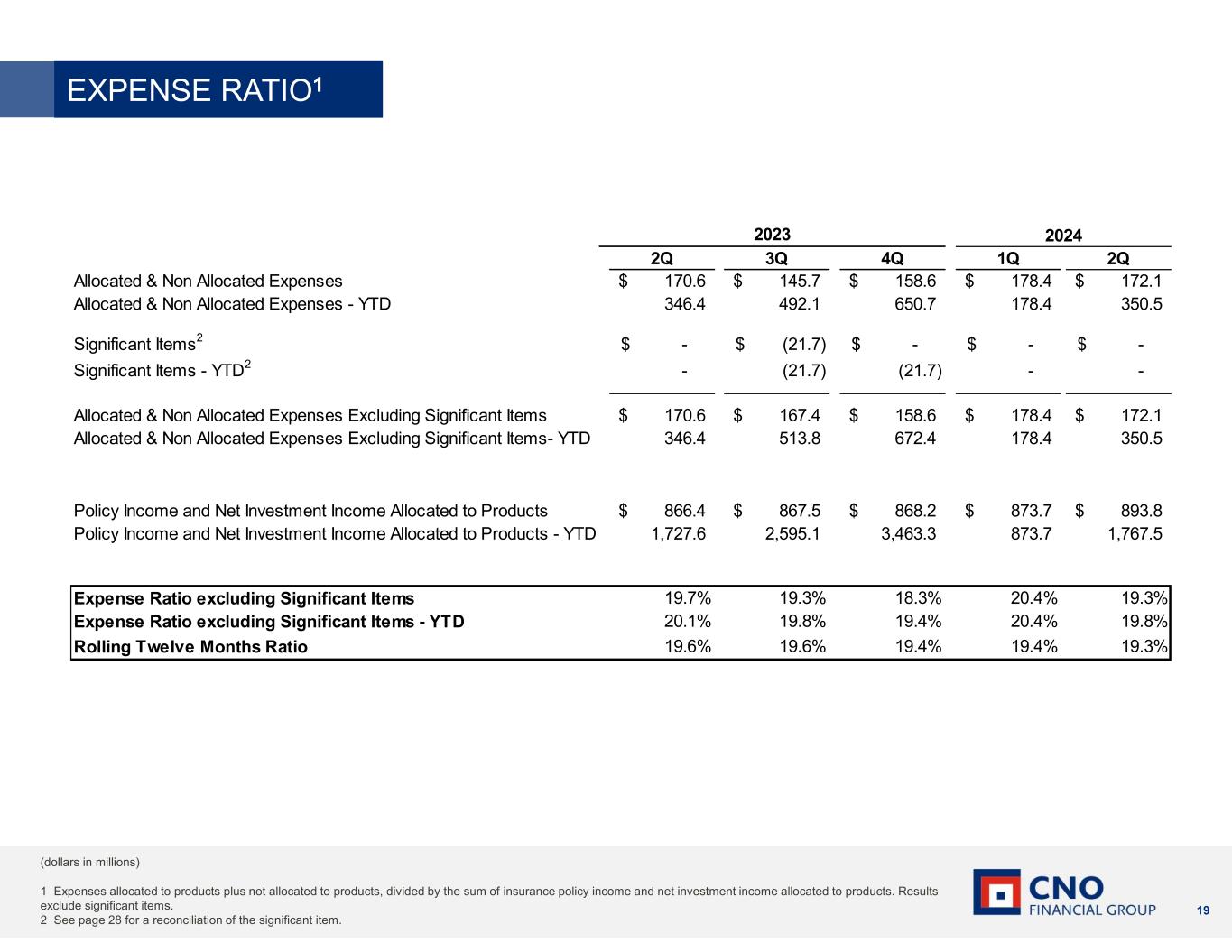 18 Account values up 24% YoY; Record $3.6 billion in client assets 1 Client assets include cash and securities in brokerage, broker/dealer customer account assets custodied directly at fund companies and insurance carriers, and assets under management in advisory accounts. Prior periods have been restated to conform with current presentation. Bankers Life is the marketing brand of various affiliated companies of CNO Financial Group including, Bankers Life and Casualty Company, Bankers Life Securities, Inc., and Bankers Life Advisory Services, Inc. Non-affiliated insurance products are offered through Bankers Life General Agency, Inc. (dba BL General Insurance Agency, Inc., AK, AL, CA, NV, PA). Agents who are financial advisors are registered with Bankers Life Securities, Inc. Securities and variable annuity products and services are offered by Bankers Life Securities, Inc. Member FINRA/SIPC, (dba BL Securities, Inc., AL, GA, IA, IL, MI, NV, PA). Advisory products and services are offered by Bankers Life Advisory Services, Inc. SEC Registered Investment Adviser (dba BL Advisory Services, Inc., AL, GA, IA, MT, NV, PA). Home Office: 303 East Wacker Drive, 5th Floor, Chicago, IL 60601. 2 Registered agents are dually licensed as insurance agents and financial representatives who can buy and sell securities for clients, and/or investment advisors who can provide ongoing investment advice for clients. 3 Representative counts represent the average of the last 3 months. (dollars in millions) BROKER-DEALER/REGISTERED INVESTMENT ADVISOR 2Q 3Q 4Q 1Q 2Q Net New Client Assets in Brokerage (4.2)$ 16.7$ (1.0)$ 10.5$ 55.9$ Brokerage and Advisory1 Advisory 41.8 47.8 18.7 57.7 82.9 Total 37.6$ 64.5$ 17.7$ 68.2$ 138.8$ Client Assets in Brokerage and Brokerage 1,626.1$ 1,597.6$ 1,729.8$ 1,855.6$ 1,932.2$ Advisory1 at end of period Advisory 1,302.0 1,307.6 1,438.2 1,590.4 1,694.6 Total 2,928.1$ 2,905.2$ 3,168.0$ 3,446.0$ 3,626.8$ Registered Agent Counts 2,3 Total 695 701 708 710 718 2023 2024