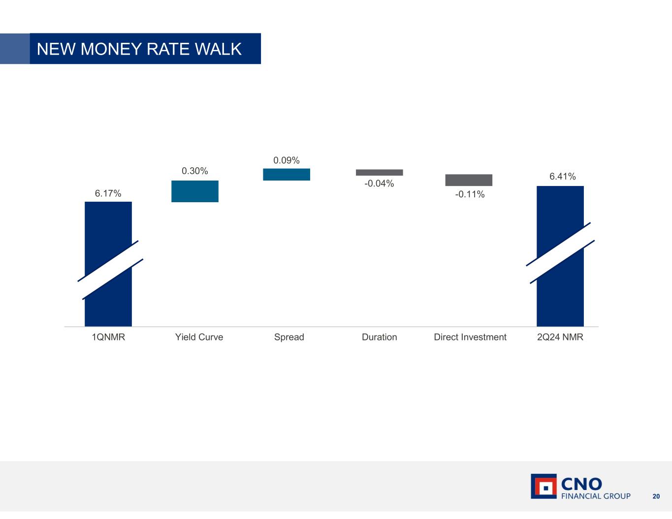 20 NEW MONEY RATE WALK 1QNMR Yield Curve Spread Duration Direct Investment 2Q24 NMR 6.17% 0.30% 0.09% -0.04% -0.11% 6.41%