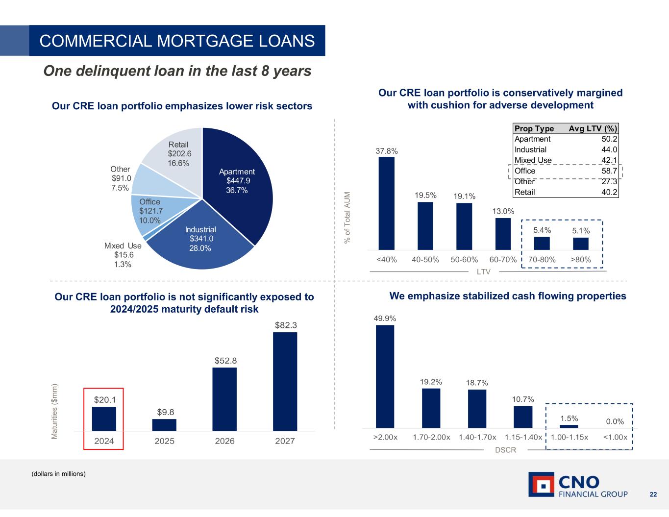 22 Prop Type Avg LTV (%) Apartment 50.2 Industrial 44.0 Mixed Use 42.1 Office 58.7 Other 27.3 Retail 40.2 37.8% 19.5% 19.1% 13.0% 5.4% 5.1% <40% 40-50% 50-60% 60-70% 70-80% >80% Our CRE loan portfolio emphasizes lower risk sectors Our CRE loan portfolio is conservatively margined with cushion for adverse development We emphasize stabilized cash flowing properties DSCR Our CRE loan portfolio is not significantly exposed to 2024/2025 maturity default risk (dollars in millions) % o f T o ta l A U M LTV COMMERCIAL MORTGAGE LOANS M a tu rit ie s ($ m m ) One delinquent loan in the last 8 years Apartment $447.9 36.7% Industrial $341.0 28.0%Mixed Use $15.6 1.3% Office $121.7 10.0% Other $91.0 7.5% Retail $202.6 16.6% $20.1 $9.8 $52.8 $82.3 2024 2025 2026 2027 49.9% 19.2% 18.7% 10.7% 1.5% 0.0% >2.00x 1.70-2.00x 1.40-1.70x 1.15-1.40x 1.00-1.15x <1.00x