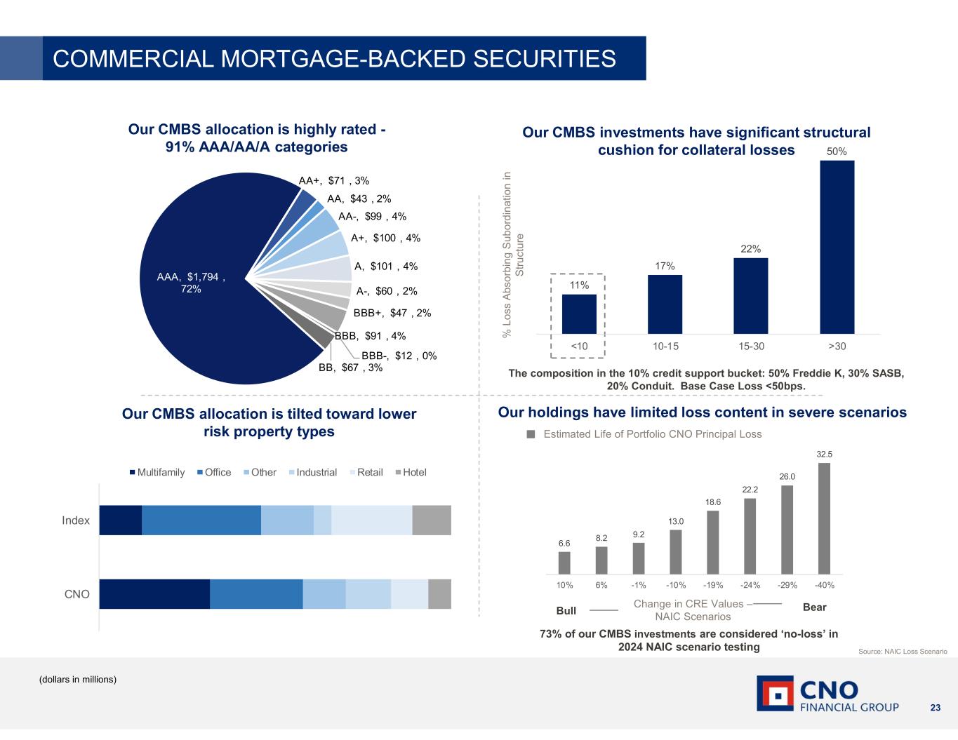 23 AAA, $1,794 , 72% AA+, $71 , 3% AA, $43 , 2% AA-, $99 , 4% A+, $100 , 4% A, $101 , 4% A-, $60 , 2% BBB+, $47 , 2% BBB, $91 , 4% BBB-, $12 , 0% BB, $67 , 3% Source: NAIC Loss Scenario Our CMBS investments have significant structural cushion for collateral losses Our holdings have limited loss content in severe scenarios Change in CRE Values – NAIC Scenarios BearBull Estimated Life of Portfolio CNO Principal Loss Our CMBS allocation is tilted toward lower risk property types Our CMBS allocation is highly rated - 91% AAA/AA/A categories 73% of our CMBS investments are considered ‘no-loss’ in 2024 NAIC scenario testing The composition in the 10% credit support bucket: 50% Freddie K, 30% SASB, 20% Conduit. Base Case Loss <50bps. % L o ss A b so rb in g S u b o rd in a tio n in S tr u ct u re (dollars in millions) COMMERCIAL MORTGAGE-BACKED SECURITIES 11% 17% 22% 50% <10 10-15 15-30 >30 CNO Index Multifamily Office Other Industrial Retail Hotel 6.6 8.2 9.2 13.0 18.6 22.2 26.0 32.5 10% 6% -1% -10% -19% -24% -29% -40%