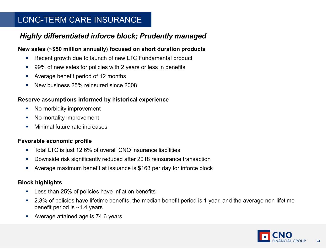 24 New sales (~$50 million annually) focused on short duration products Recent growth due to launch of new LTC Fundamental product 99% of new sales for policies with 2 years or less in benefits Average benefit period of 12 months New business 25% reinsured since 2008 Reserve assumptions informed by historical experience No morbidity improvement No mortality improvement Minimal future rate increases Favorable economic profile Total LTC is just 12.6% of overall CNO insurance liabilities Downside risk significantly reduced after 2018 reinsurance transaction Average maximum benefit at issuance is $163 per day for inforce block Block highlights Less than 25% of policies have inflation benefits 2.3% of policies have lifetime benefits, the median benefit period is 1 year, and the average non-lifetime benefit period is ~1.4 years Average attained age is 74.6 years Highly differentiated inforce block; Prudently managed LONG-TERM CARE INSURANCE