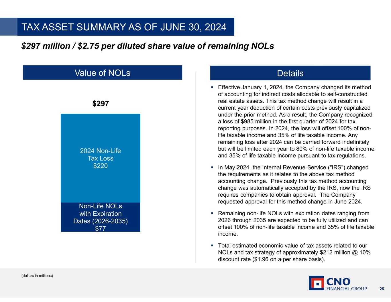 25 Value of NOLs Details Effective January 1, 2024, the Company changed its method of accounting for indirect costs allocable to self-constructed real estate assets. This tax method change will result in a current year deduction of certain costs previously capitalized under the prior method. As a result, the Company recognized a loss of $985 million in the first quarter of 2024 for tax reporting purposes. In 2024, the loss will offset 100% of non- life taxable income and 35% of life taxable income. Any remaining loss after 2024 can be carried forward indefinitely but will be limited each year to 80% of non-life taxable income and 35% of life taxable income pursuant to tax regulations. In May 2024, the Internal Revenue Service ("IRS") changed the requirements as it relates to the above tax method accounting change. Previously this tax method accounting change was automatically accepted by the IRS, now the IRS requires companies to obtain approval. The Company requested approval for this method change in June 2024. Remaining non-life NOLs with expiration dates ranging from 2026 through 2035 are expected to be fully utilized and can offset 100% of non-life taxable income and 35% of life taxable income. Total estimated economic value of tax assets related to our NOLs and tax strategy of approximately $212 million @ 10% discount rate ($1.96 on a per share basis). $297 (dollars in millions) $297 million / $2.75 per diluted share value of remaining NOLs Non-Life NOLs with Expiration Dates (2026-2035) $77 2024 Non-Life Tax Loss $220 TAX ASSET SUMMARY AS OF JUNE 30, 2024