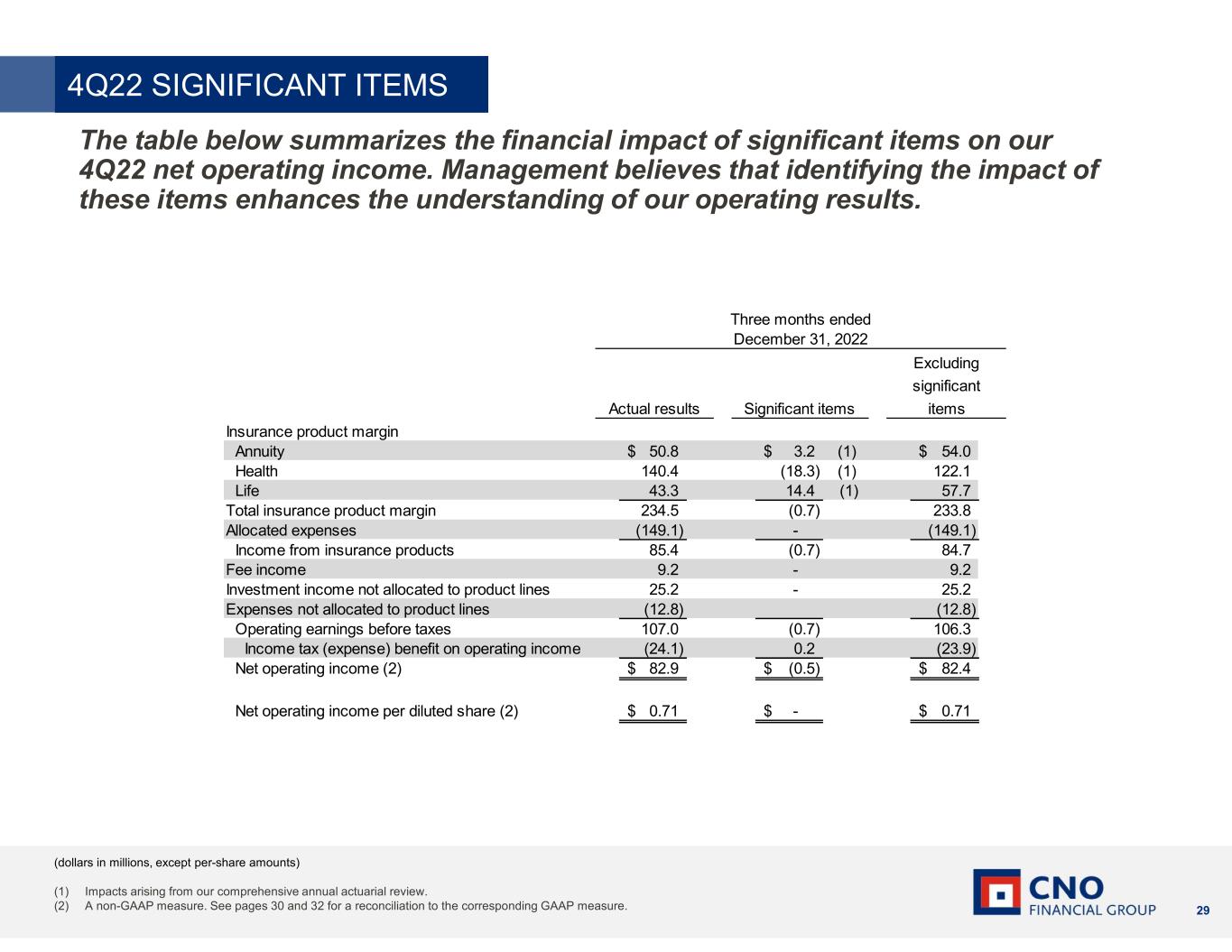 28 Insurance product margin Annuity 57.0$ -$ 57.0$ Health 123.2 - 123.2 Life 59.8 - 59.8 Total insurance product margin 240.0 - 240.0 Allocated expenses (153.2) - (153.2) Income from insurance products 86.8 - 86.8 Fee income (2.9) - (2.9) Investment income not allocated to product lines 38.4 - 38.4 Expenses not allocated to product lines 7.5 (21.7) (1) (14.2) Operating earnings before taxes 129.8 (21.7) 108.1 Income tax (expense) benefit on operating income (28.5) 4.8 (23.7) Net operating income (2) 101.3$ (16.9)$ 84.4$ Net operating income per diluted share (2) 0.88$ (0.14)$ 0.74$ Three months ended September 30, 2023 Actual results Significant items Excluding significant items (dollars in millions, except per-share amounts) (1) Comprised of $21.7 million of legal recoveries, net of expenses and increased legal accruals. (2) A non-GAAP measure. See pages 30 and 32 for a reconciliation to the corresponding GAAP measure. The table below summarizes the financial impact of significant items on our 3Q23 net operating income. Management believes that identifying the impact of these items enhances the understanding of our operating results. 3Q23 SIGNIFICANT ITEMS