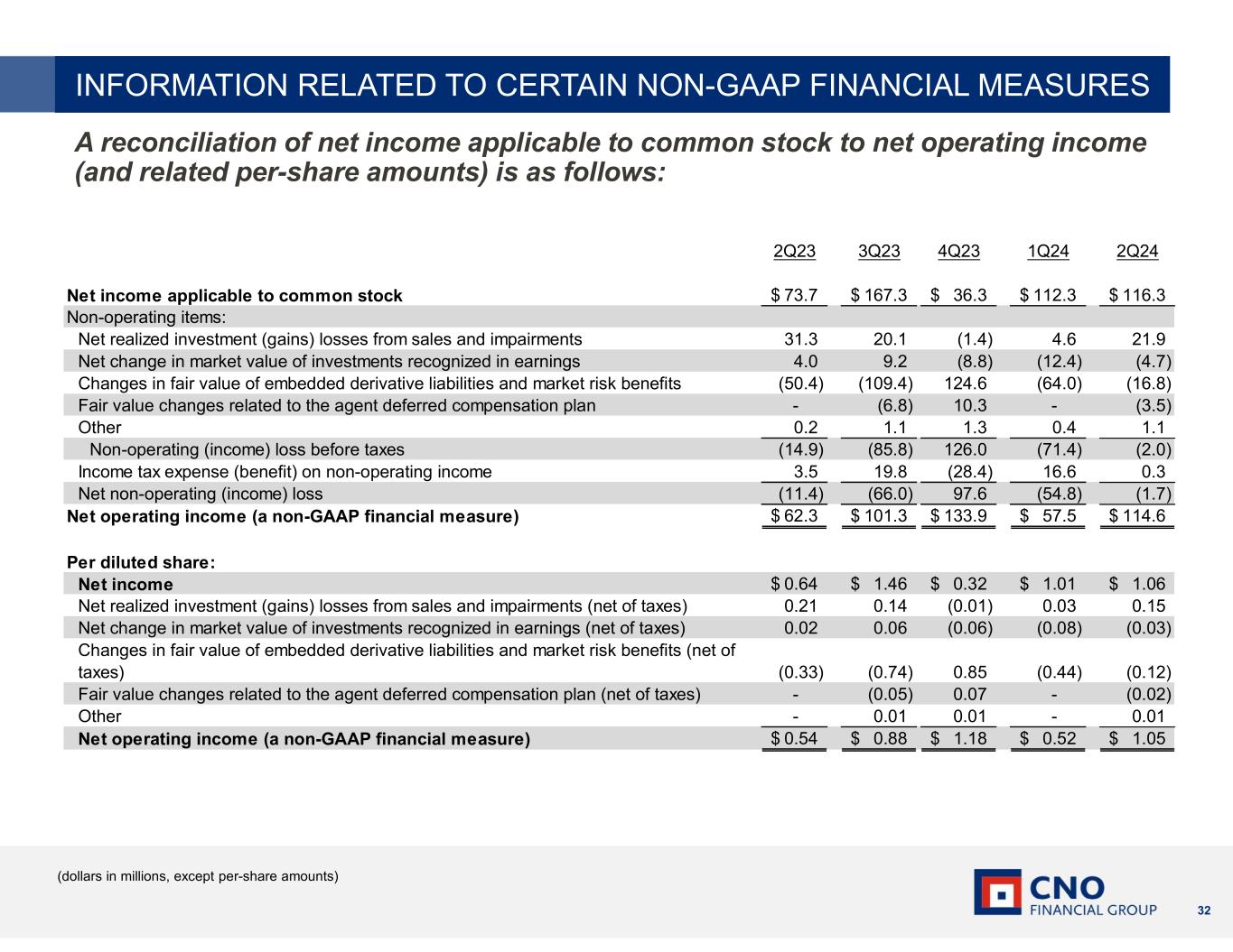 31 The following provides additional information regarding certain non-GAAP measures used in this presentation. A non-GAAP measure is a numerical measure of a company’s performance, financial position, or cash flows that excludes or includes amounts that are normally excluded or included in the most directly comparable measure calculated and presented in accordance with GAAP. While management believes these measures are useful to enhance understanding and comparability of our financial results, these non-GAAP measures should not be considered as substitutes for the most directly comparable GAAP measures. Additional information concerning non-GAAP measures is included in our periodic filings with the Securities and Exchange Commission that are available in the “Investors – SEC Filings” section of CNO’s website, www.CNOinc.com. Operating earnings measures Management believes that an analysis of net income applicable to common stock before net realized investment gains or losses from sales, impairments and change in allowance for credit losses, net change in market value of investments recognized in earnings, changes in fair value of embedded derivative liabilities and market risk benefits related to our fixed indexed annuities, fair value changes related to the agent deferred compensation plan, loss on extinguishment of debt, changes in the valuation allowance for deferred tax assets and other tax items and other non-operating items consisting primarily of earnings attributable to variable interest entities (“net operating income,” a non- GAAP financial measure) is important to evaluate the financial performance of the Company and is a key measure commonly used in the life insurance industry. Management uses this measure to evaluate performance because the items excluded from net operating income can be affected by events that are unrelated to the Company’s underlying fundamentals. INFORMATION RELATED TO CERTAIN NON-GAAP FINANCIAL MEASURES