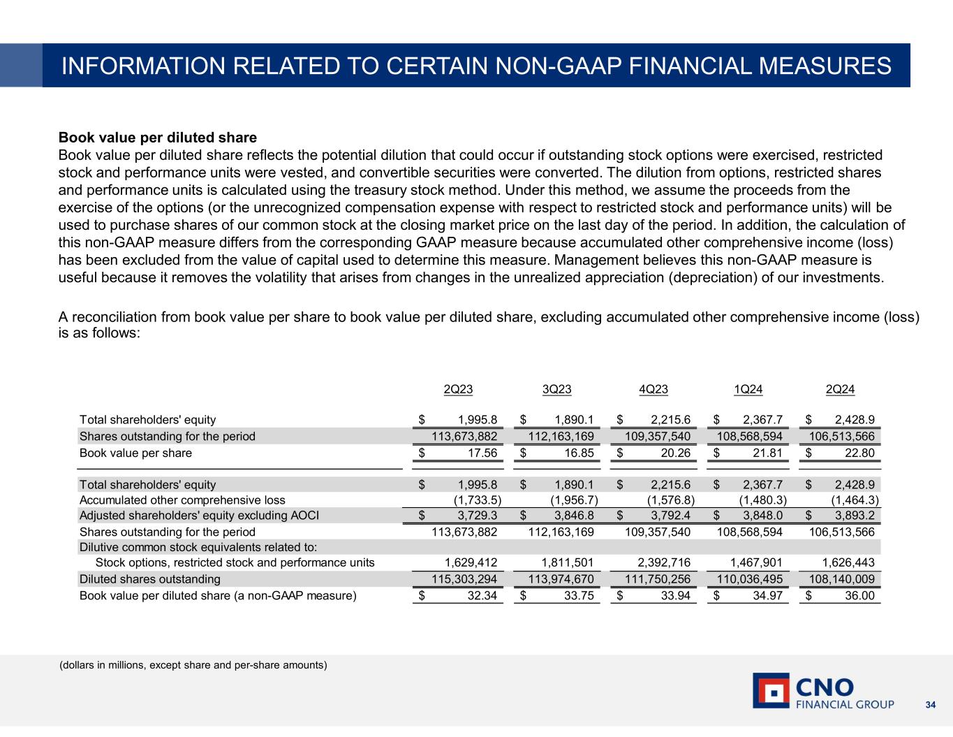 34 Book value per diluted share Book value per diluted share reflects the potential dilution that could occur if outstanding stock options were exercised, restricted stock and performance units were vested, and convertible securities were converted. The dilution from options, restricted shares and performance units is calculated using the treasury stock method. Under this method, we assume the proceeds from the exercise of the options (or the unrecognized compensation expense with respect to restricted stock and performance units) will be used to purchase shares of our common stock at the closing market price on the last day of the period. In addition, the calculation of this non-GAAP measure differs from the corresponding GAAP measure because accumulated other comprehensive income (loss) has been excluded from the value of capital used to determine this measure. Management believes this non-GAAP measure is useful because it removes the volatility that arises from changes in the unrealized appreciation (depreciation) of our investments. A reconciliation from book value per share to book value per diluted share, excluding accumulated other comprehensive income (loss) is as follows: (dollars in millions, except share and per-share amounts) INFORMATION RELATED TO CERTAIN NON-GAAP FINANCIAL MEASURES 2Q23 3Q23 4Q23 1Q24 2Q24 Total shareholders' equity 1,995.8$ 1,890.1$ 2,215.6$ 2,367.7$ 2,428.9$ Shares outstanding for the period 113,673,882 112,163,169 109,357,540 108,568,594 106,513,566 Book value per share 17.56$ 16.85$ 20.26$ 21.81$ 22.80$ Total shareholders' equity 1,995.8$ 1,890.1$ 2,215.6$ 2,367.7$ 2,428.9$ Accumulated other comprehensive loss (1,733.5) (1,956.7) (1,576.8) (1,480.3) (1,464.3) Adjusted shareholders' equity excluding AOCI 3,729.3$ 3,846.8$ 3,792.4$ 3,848.0$ 3,893.2$ Shares outstanding for the period 113,673,882 112,163,169 109,357,540 108,568,594 106,513,566 Dilutive common stock equivalents related to: Stock options, restricted stock and performance units 1,629,412 1,811,501 2,392,716 1,467,901 1,626,443 Diluted shares outstanding 115,303,294 113,974,670 111,750,256 110,036,495 108,140,009 Book value per diluted share (a non-GAAP measure) 32.34$ 33.75$ 33.94$ 34.97$ 36.00$