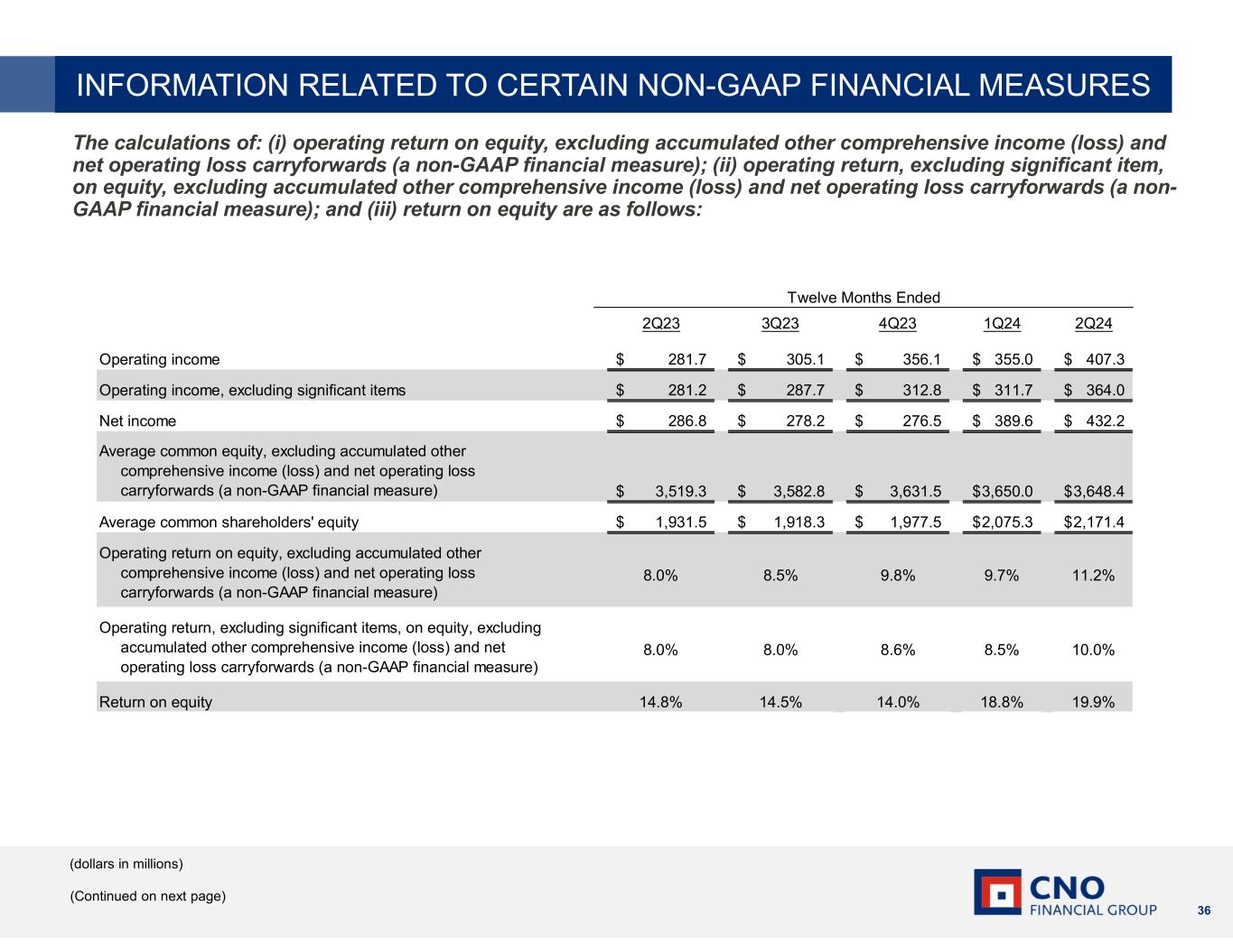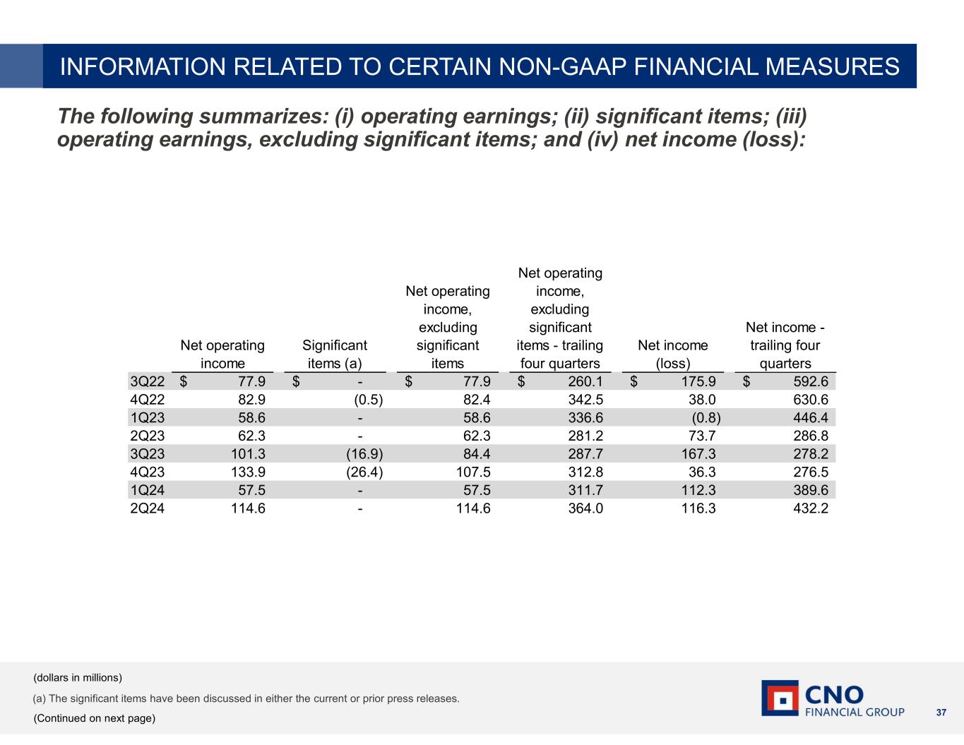 36 The calculations of: (i) operating return on equity, excluding accumulated other comprehensive income (loss) and net operating loss carryforwards (a non-GAAP financial measure); (ii) operating return, excluding significant item, on equity, excluding accumulated other comprehensive income (loss) and net operating loss carryforwards (a non- GAAP financial measure); and (iii) return on equity are as follows: (dollars in millions) (Continued on next page) INFORMATION RELATED TO CERTAIN NON-GAAP FINANCIAL MEASURES 2Q23 3Q23 4Q23 1Q24 2Q24 Operating income 281.7$ 305.1$ 356.1$ 355.0$ 407.3$ Operating income, excluding significant items 281.2$ 287.7$ 312.8$ 311.7$ 364.0$ Net income 286.8$ 278.2$ 276.5$ 389.6$ 432.2$ Average common equity, excluding accumulated other comprehensive income (loss) and net operating loss carryforwards (a non-GAAP financial measure) 3,519.3$ 3,582.8$ 3,631.5$ 3,650.0$ 3,648.4$ Average common shareholders' equity 1,931.5$ 1,918.3$ 1,977.5$ 2,075.3$ 2,171.4$ Operating return on equity, excluding accumulated other comprehensive income (loss) and net operating loss carryforwards (a non-GAAP financial measure) 8.0% 8.5% 9.8% 9.7% 11.2% Operating return, excluding significant items, on equity, excluding accumulated other comprehensive income (loss) and net operating loss carryforwards (a non-GAAP financial measure) 8.0% 8.0% 8.6% 8.5% 10.0% Return on equity 14.8% 14.5% 14.0% 18.8% 19.9% Twelve Months Ended